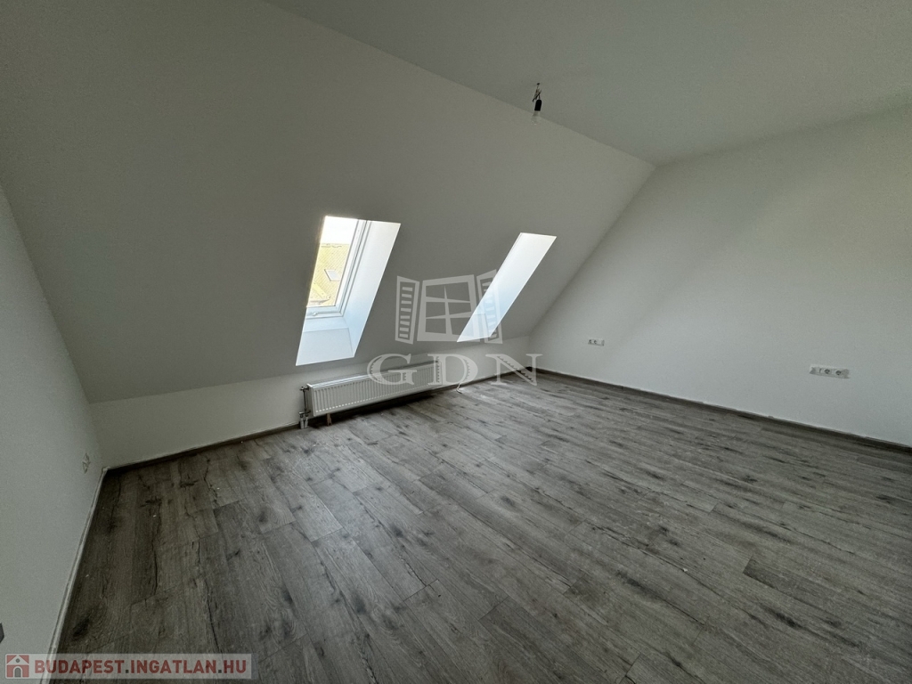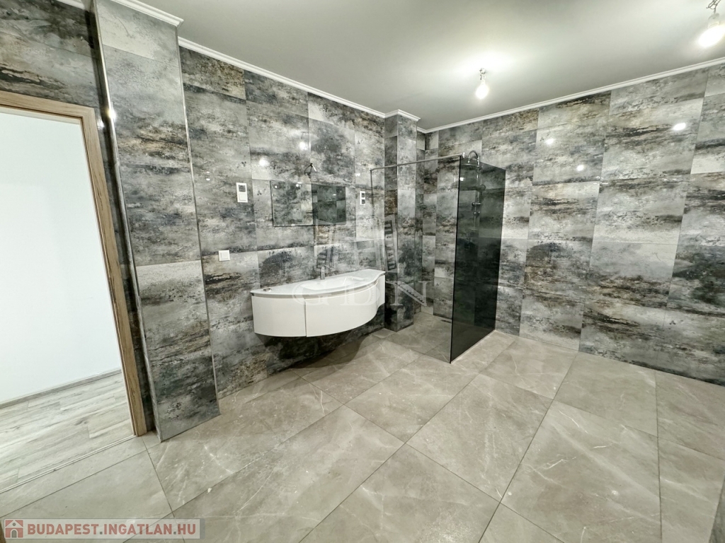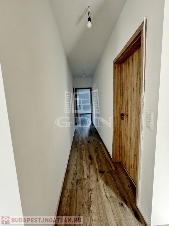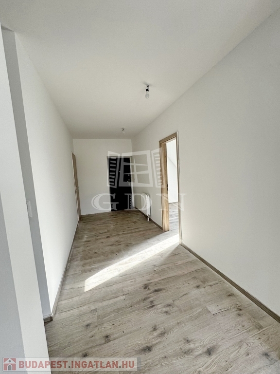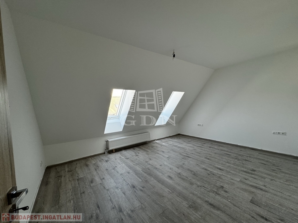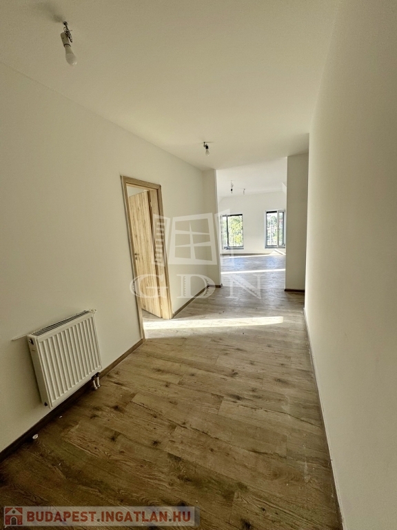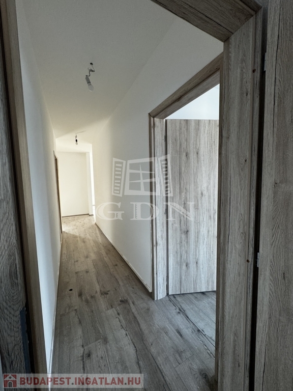 A 120 nm-es lakás egy újépítésű, háromszintes társasház 2. emeletén található, és új lakóját várja. Belépve tágas előtér fogad, innen nyílik a külön WC és az egyik hálószoba, szemben pedig a világos, amerikai konyhás nappali. A közlekedőből jobbra haladva érjük el a fürdőszobát és a további két hálószobát. A fürdőt járólap, a többi helyiséget parketta borítja.