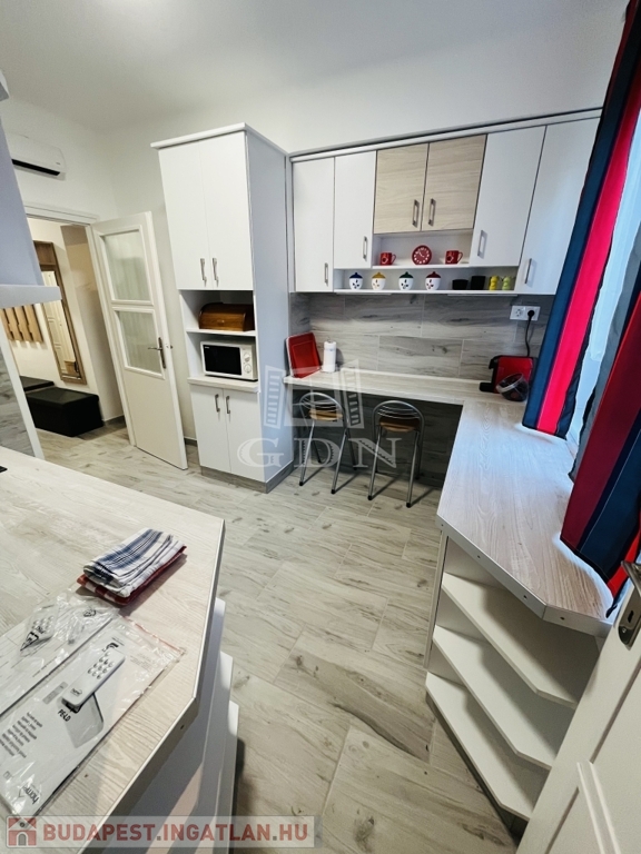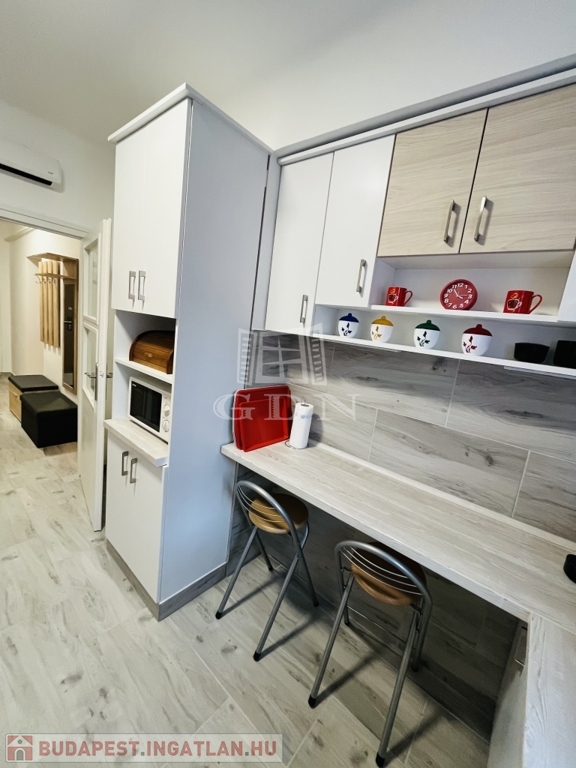 A konyhában új, még garanciális indukciós főzőlap, valamint mikró, hűtő-fagyasztó és mosógép áll a bérlő rendelkezésére. A spejz külön helyiségből nyílik, praktikus tárolási lehetőséget biztosítva.