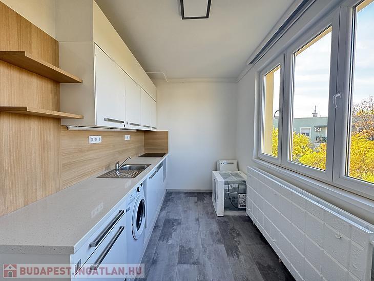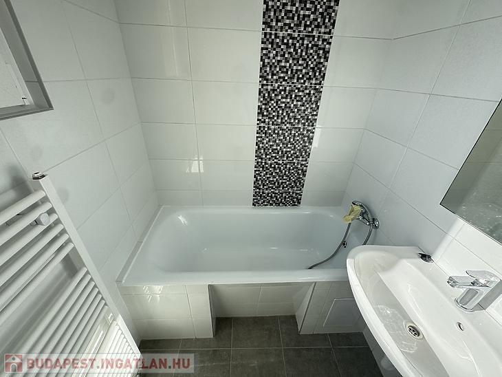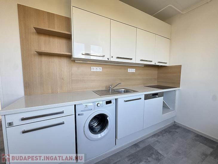 A konyha gépesített, mosógéppel és mosogatógéppel felszerelt, a sütő beépítése pedig hamarosan megtörténik. A folyosón praktikus beépített szekrénysor található. A fürdőszoba kádas kialakítású, törölközőszárítóval ellátva, a WC külön helyiségben kapott helyet. A lakás bútorozatlan, novembertől költözhető.
