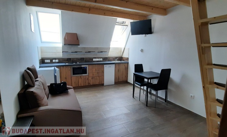 A tetőtéri lakásban a konyha teljesen felszerelt, mosogatógép, mikró, 2 lapos gáz. Az asztal, székek, hűtő, TV .