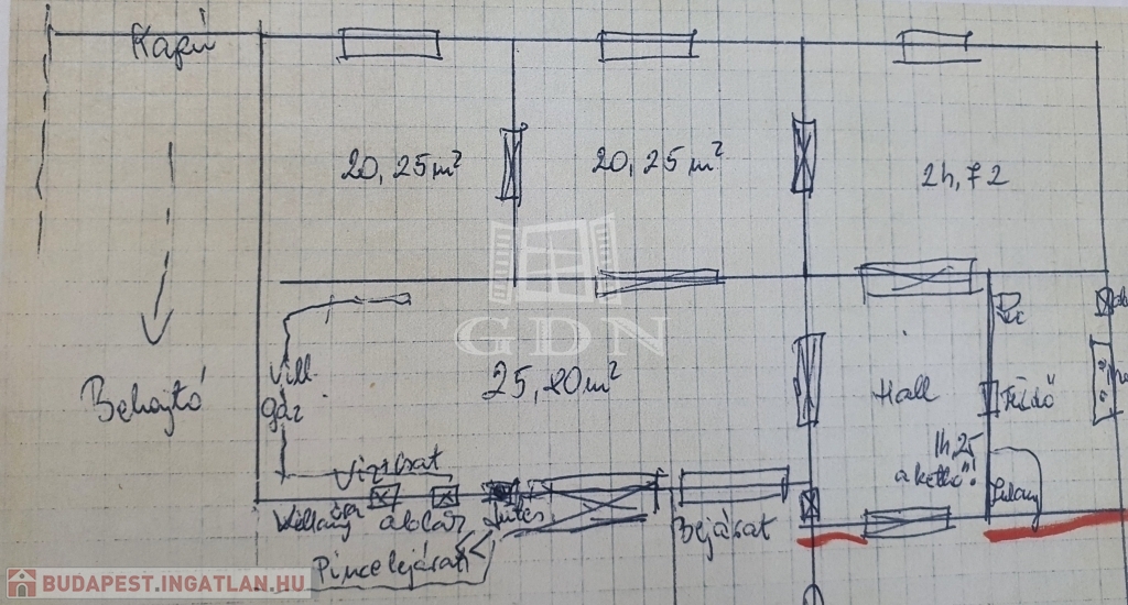 - 3 utcára néző helyiség, 20, 20, 25 nm alapterületűek, köztük 3 szárnyú fa beltéri ajtók,
