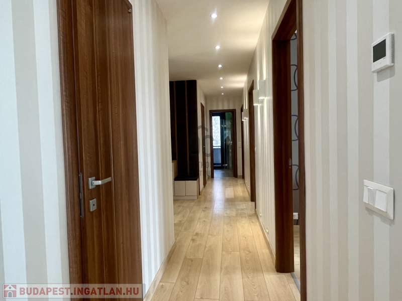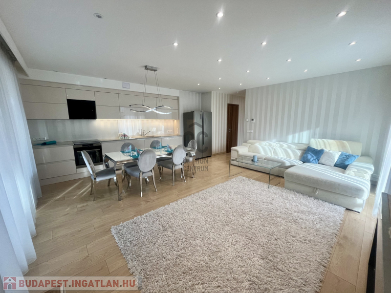 A lakás tökéletes elrendezésű: a központi tér a napfényben úszó, nagyvonalú nappali, mely prémium sarokülővel és LED TV-vel szolgálja a kényelmet. Innen nyílik az elegáns, amerikai stílusú konyha, melyet egyedi tervezésű, teljesen gépesített konyhabútor (főzőlap, sütő, mikró, mosogatógép, hűtő, elszívó, vízlágyító, ozmózis víztisztító) és egy gyönyörű étkező tesz teljessé. Az egyik hálószobában egy nagyméretű, gondosan megtervezett beépített gardrób kapott helyet, a további két szoba pedig igény szerint berendezhető.