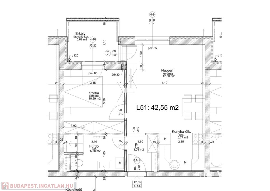 Az ingatlan egy liftes társasház negyedik emeletnén található, alapterülete: 42,55m2, egy nappaliból nyíló 5,69 m2-es erkéllyel.