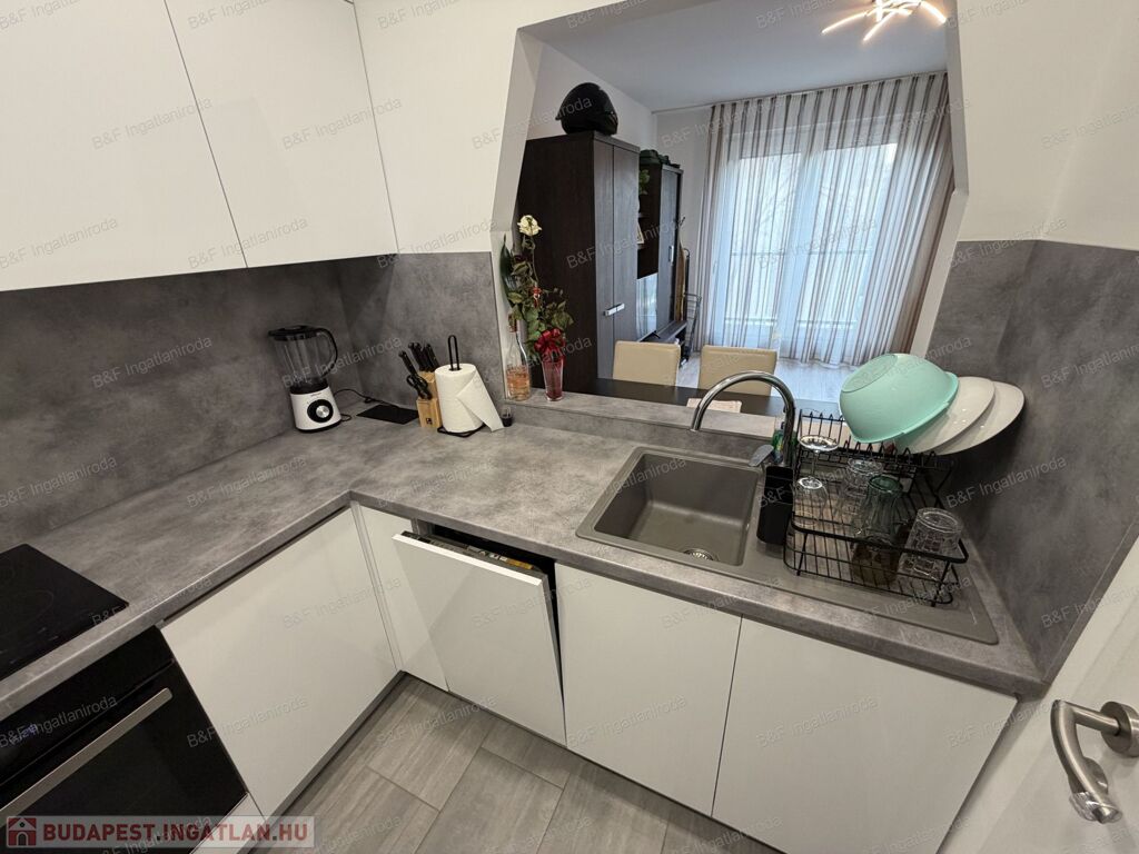 Gépesített konyhával (beépített sütő, kerámia főzőlap, beépített mikró, mosogatógép, hűtő, páraelszívó), étkezővel, tágas nappalival és szép fürdőszobával várja új lakóit.