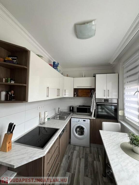 Modern felszereltség: Gépesített konyhabútor, az ablakokon pedig redőny és szúnyogháló gondoskodik a komfortról.
