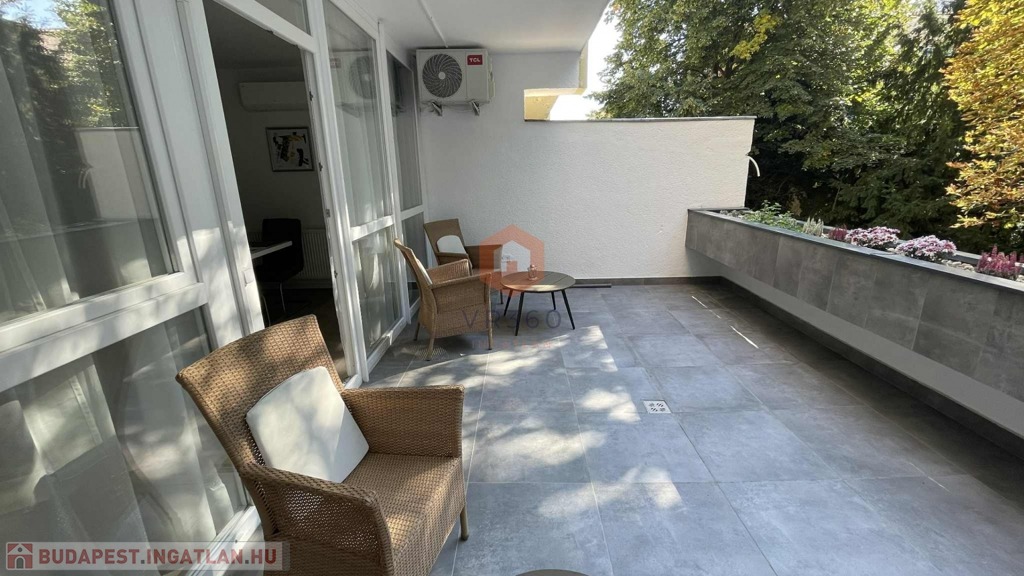 72 m2 földszinti elhelyezkedés + 20 m2-es déli fekvésű terasz, igényes kerti bútorokkal, nyugodt, csendes környezetben!