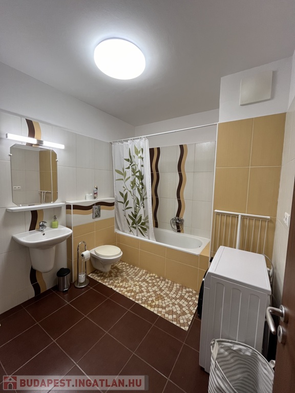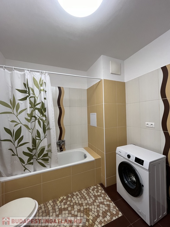 A lakásba lépve egy előszobába jutunk, melyből balra nyílik a káddal és mosógéppel ellátott fürdőszoba.