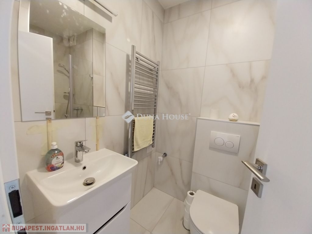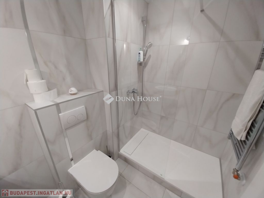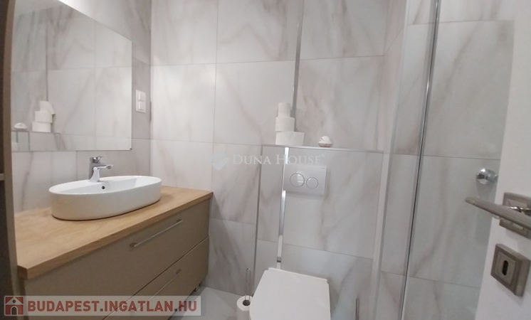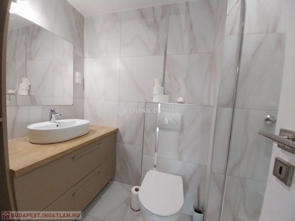 A fürdőszobába zuhanykabin került beépítésre, a mellékhelyiség nem szeparált.