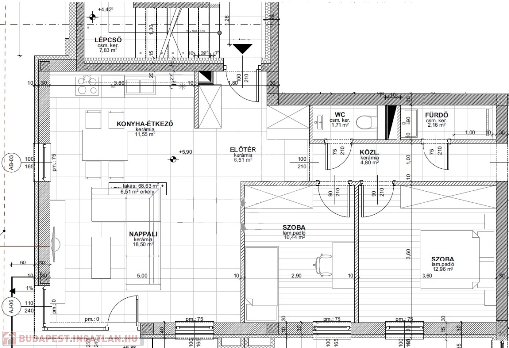 A lakás 69 nm nagyságú, nappali + 2 hálószoba elosztású, erkélye 7 nm nagyságú. A zuhanyzós fürdő és a wc külön helységben található.
