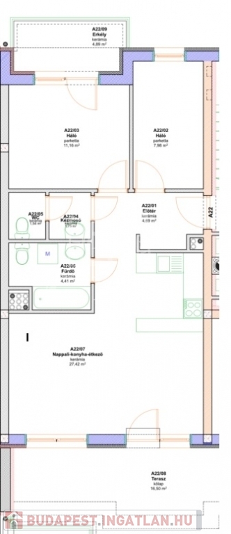 Az ingatlan gépesített konyhával (hűtőszekrény, mosógatógép, indukciós főzőlap, villanytűzhely, páraelszívó), két hálószobával + nappalival + 2 db nagy terasszal rendelkezik, összesen 70 m2.