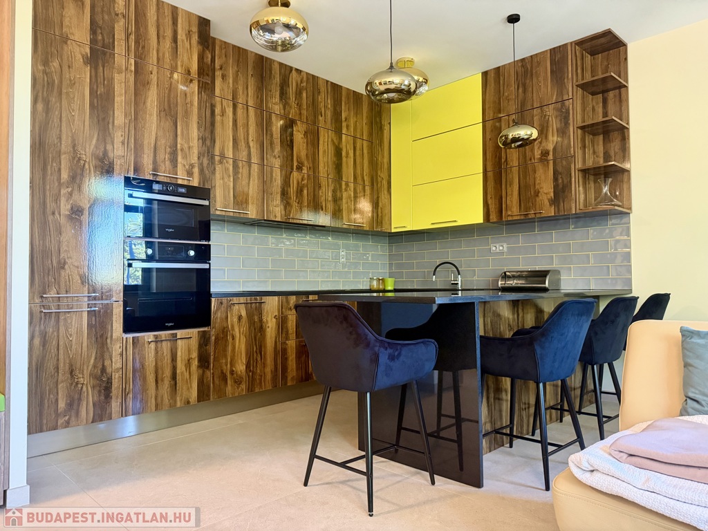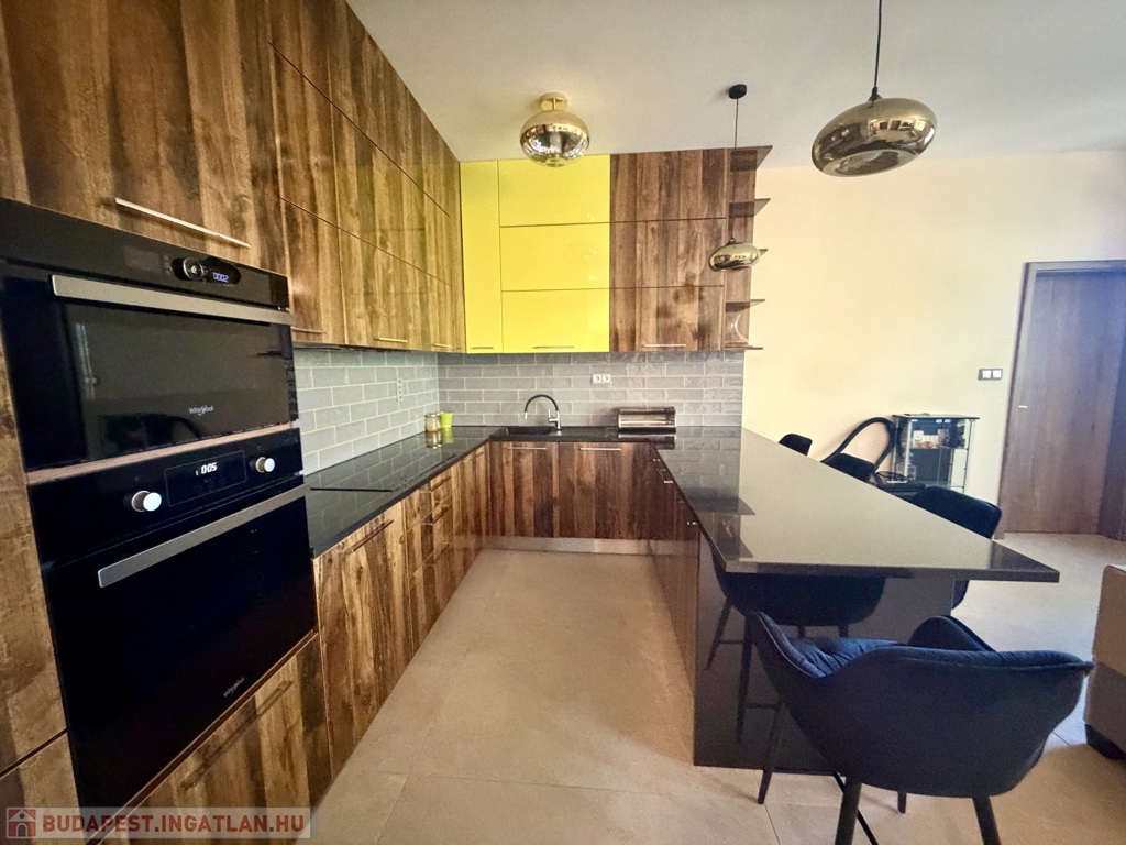 A prémium minőségű beépített konyha minden igényt kielégít – modern gépekkel, letisztult dizájnnal és minőségi anyagokkal. A lakás akár teljes bútorzattal is bérelhető, ízléses, harmonikus berendezéssel.