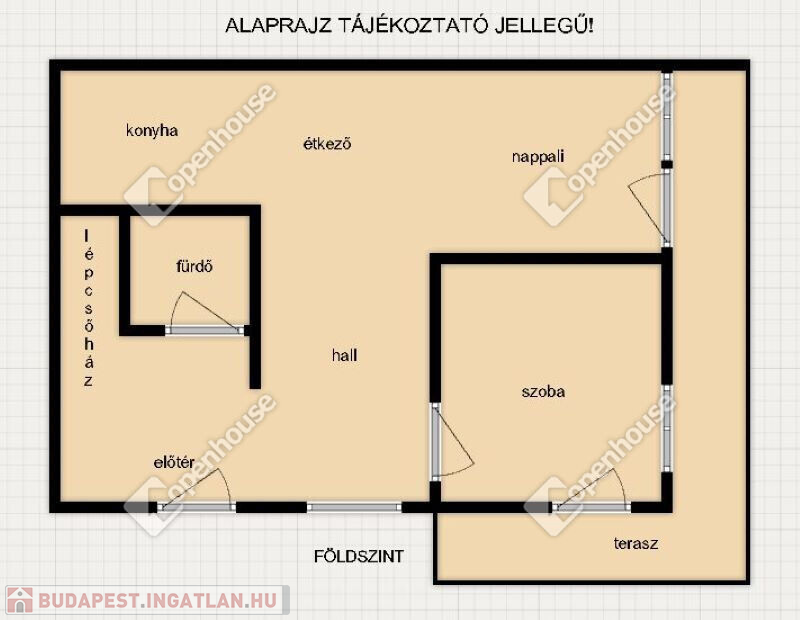 - helyiségek földszinten: nappali-konyha-étkező, előszoba-lépcsőház, fürdőszoba, hálószoba, terasz