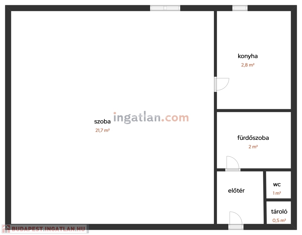 szoba 18,00m2, fürdőszoba 2,00m2, konyha-étkező-nappali 4,00m2, közlekedő-előtér 3,00m2, wc 1,00m2;