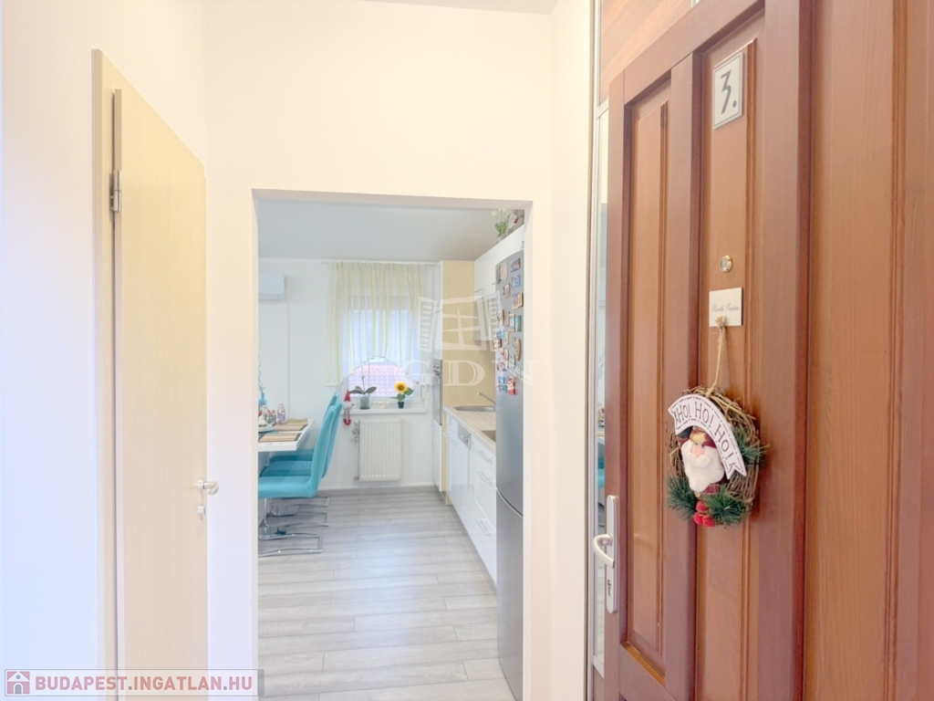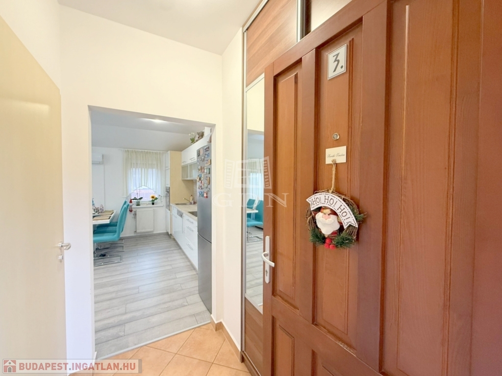 A zárt udvarról megközelíthető tégla lakás tágas terek által ad helyet egy beépített szekrénnyel ellátott előtérnek, egy nagyméretű nappali - konyha - étkező együttesnek, két külön nyíló hálónak - melyből az egyik kapcsolatos a 8 m2 - es erkéllyel, egy épített zuhanyzóval felszerelt fürdőnek, valamint egy külön helyiségben található toalettnek.