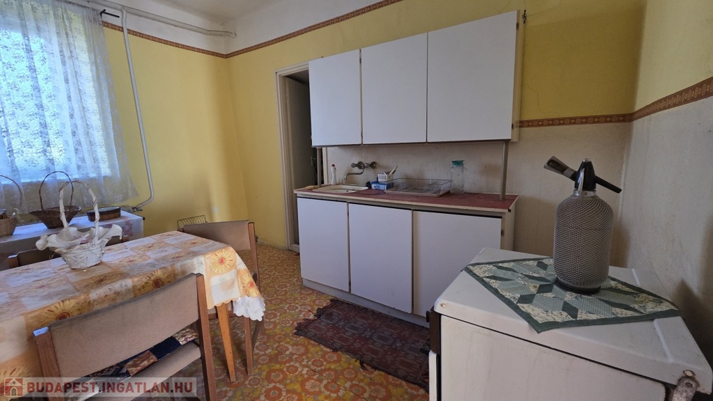 Belépve egy tágas előszobában találjuk magunkat. Innen érhető el mindhárom szoba, illetve a konyha. Szobái óriásiak, a legnagyobb 28 m2, tehát akár még több szoba is kialakítható benne. 3 cserépkályhával oldották meg a fűtést, de gázkazánt is találunk benne. Az ingatlan eredetileg részben körbejárható volt, azonban a konyhát és a szobát összekötő ajtót megszüntették. Bármikor újra nyitható.