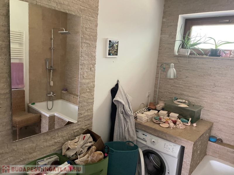 A ház helyiségei: Földszint: előszoba, nappali, konyha, háló, fürdőszoba, WC, lépcsőház, 8 m2 télikert, 5 m2 tároló (kintről megközelíthető), tágas terasz Tetőtér: külön bejárattal is rendelkezik, nappali + konyha, 2 hálószoba, fürdőszoba, 2 erkély