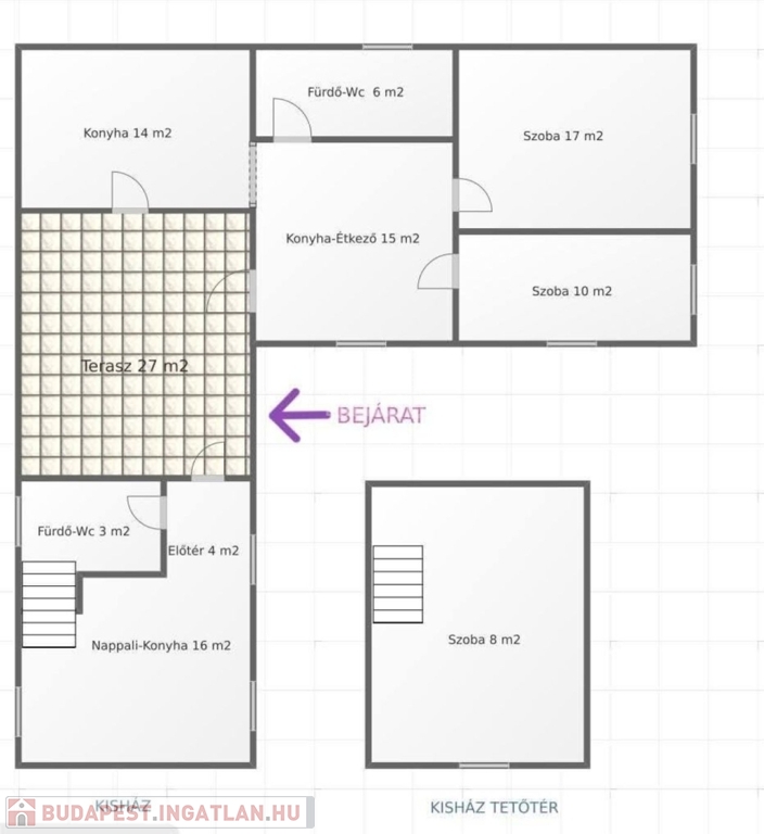 A ház alapterülete 62 nm, 2 és fél szoba, konyha, fürdőszoba, amelyhez egy 27 nm terasz is tartozik, ami egy 31 nm téliesített faházhoz kapcsolódik, ebben található szoba, konyha, nappalival és fürdőszoba, alatta 16 nm pince. A telek 2809 nm, aminek a hátulsó része gazdálkodásra is alkalmas. A ház fűtéséről gázkazán gondoskodik, így a téli hónapokban is kellemes a meleg.