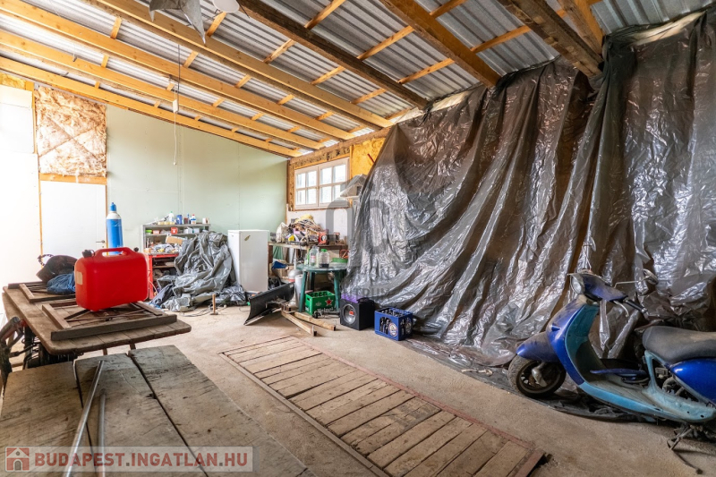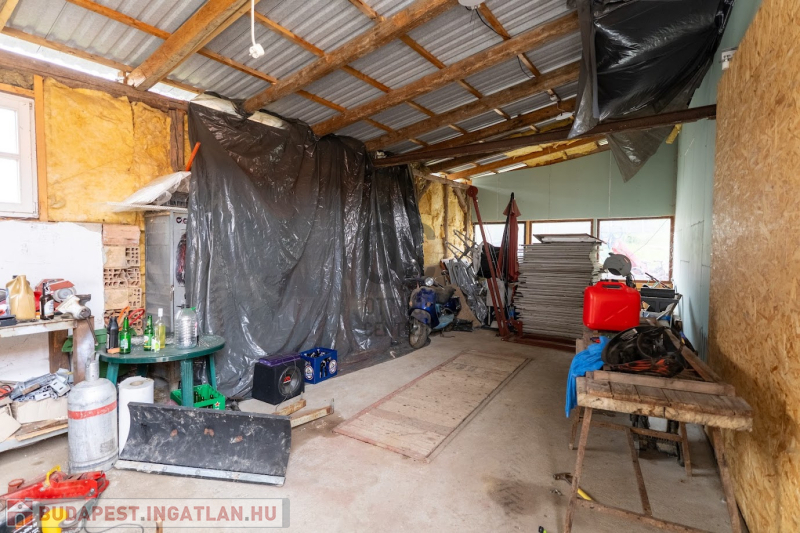 - Nagy méretű könnyűszerkezetes garázs vagy műhely épült mellé tolókapuval,mérete 50m2 3,5 méteres belmagassággal