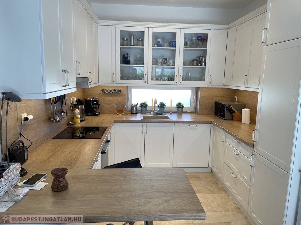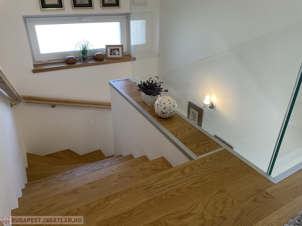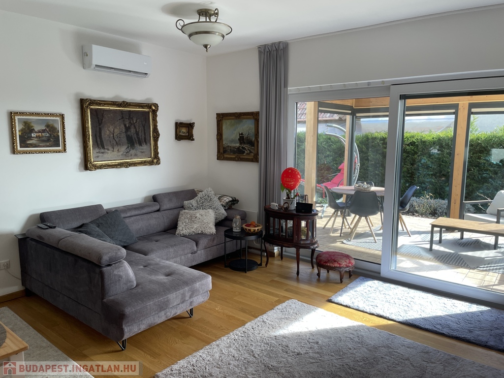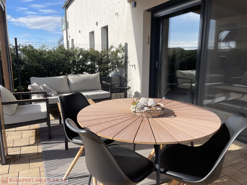 A földszinten található tágas, napfényes nappali–konyha–étkező egy légtérben helyezkedik el, közvetlen teraszkapcsolattal. A kert felé nyíló tér természetes módon köti össze a belső életteret a szabadtéri pihenéssel – nyári vacsorákhoz, baráti beszélgetésekhez vagy egy nyugodt balatoni estéhez ideális választás. A kerti terasz elektromos árnyékolóval felszerelt, így a legmelegebb napokon is kellemes marad.