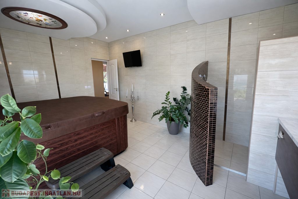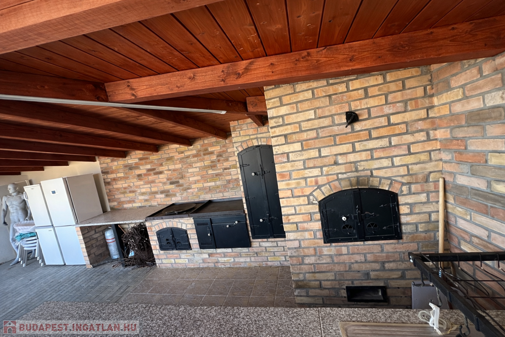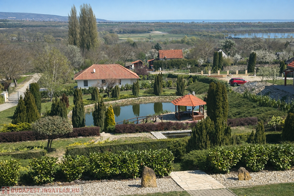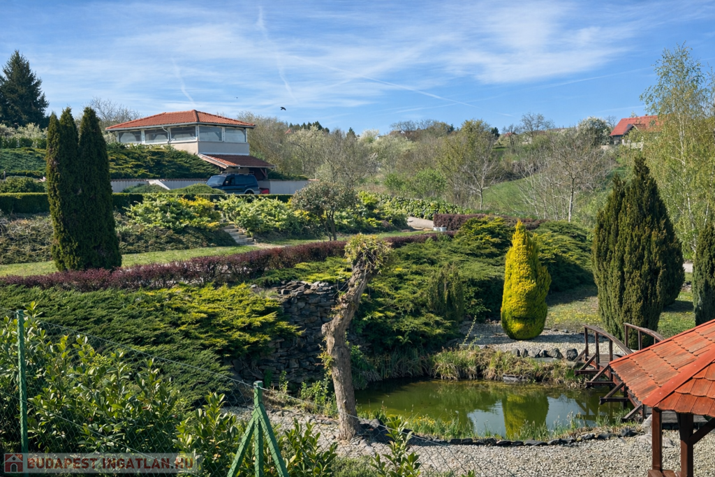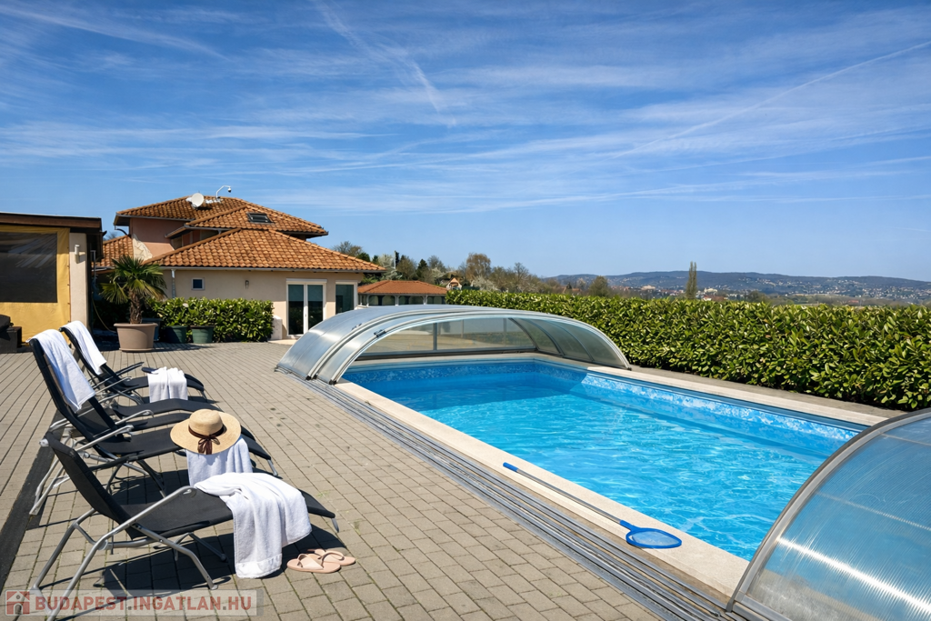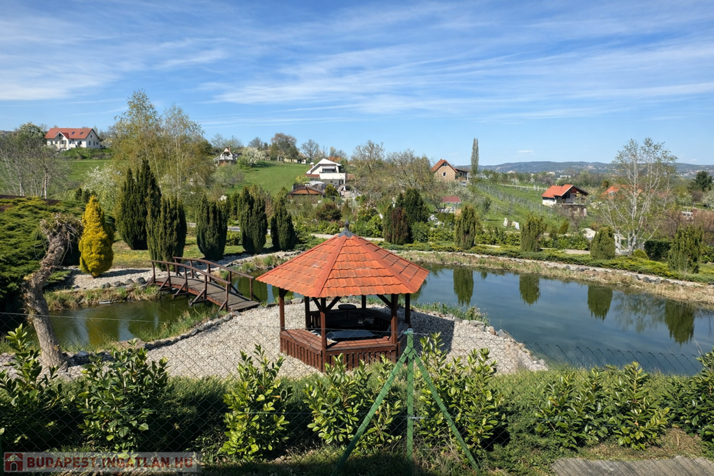 A gondozott kert számos lehetőséget kínál a pihenésre: 120 m²-es grillterasz, kerti sütögető, valamint egy hangulatos, 45 m²-es fedett kerti pavilon áll rendelkezésre. Emellett egy fedett medence is kialakításra került (10 × 4 m, kb. 1,5 m mély), amely üvegtetővel lefedhető, így szinte egész évben használható. A kertben dekoratív tó, saját kút és automata öntözőrendszer is helyet kapott.
