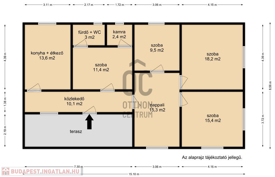 4 külön nyíló szoba, tágas nappali, konyha-étkező, fürdő–WC, kamra, közlekedő és egy kellemes terasz alkotja