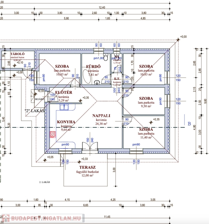 Külső falazat: Ytong 30 cm-es, 12 cm-es Dryvit hőszigeteléssel, 20 cm-es cellulóz alapú fújt födém szigeteléssel.