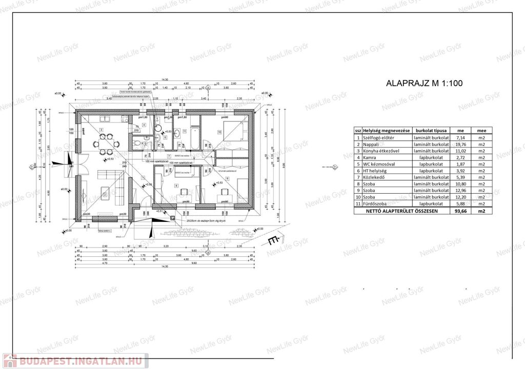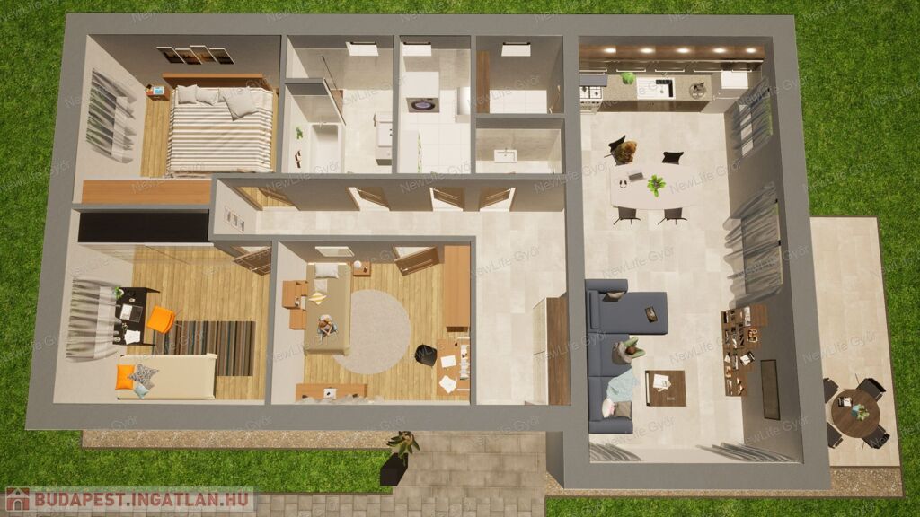 Elosztása: Előtér, közlekedő, amerikai konyhás nappali étkezővel, kamra, három szoba, fürdőszoba, külön WC, háztartási helyiség.