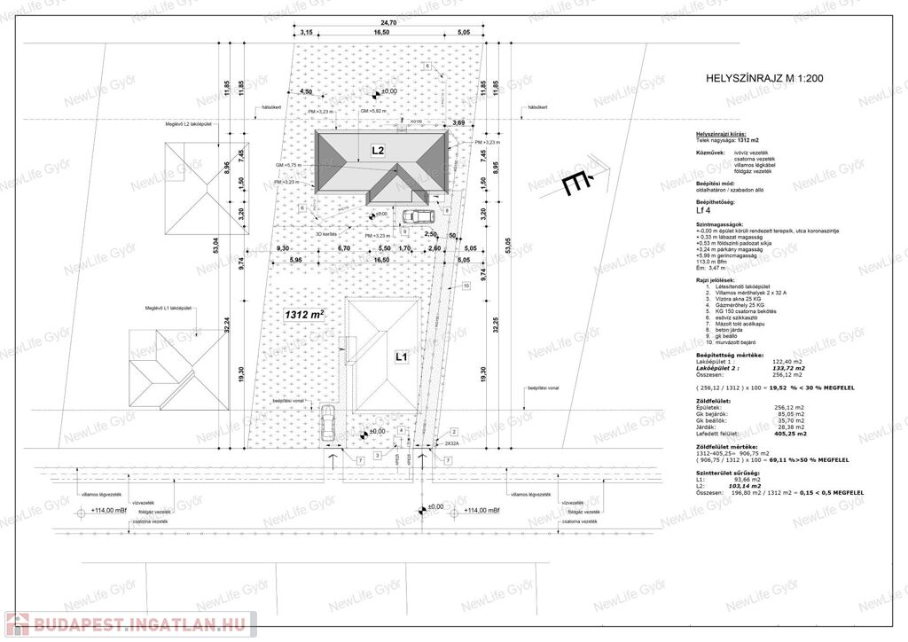 Két ház egymás mögött helyezkedik el, külön bejárattal, kb 25 m-es utcafronttal rendelkeznek, magánszférát megőrizve nincs átjárás a másik udvarán. A helyszínrajzon jól látható, hogy az L2 (hátsó) épület az L1 (első) épület mögötti úton tudja megközelíteni saját udvarát, így teljesen különálló családi házként funkcionálnak. Nincs közös fal, nincs közös garázs vagy tároló. A két ház egymástól kb. 20 méter távolságban épülnek.