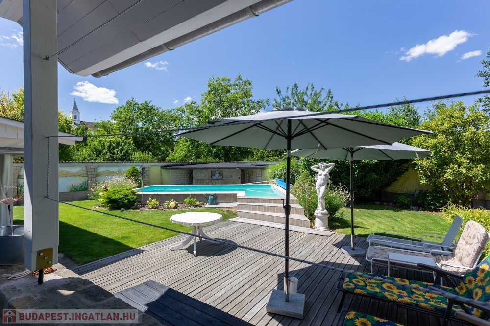 A gondozott díszkertben helyet kapott egy 8x4 méteres kültéri, épített medence, mely a meleg nyári napokon kínál tökéletes felüdülést.