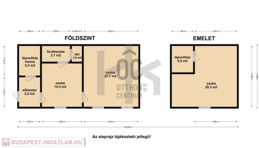 -földszinten: 1 szoba (27,7 m2), konyha fürdőszoba, WC, előszoba, lépcsőház,kamra