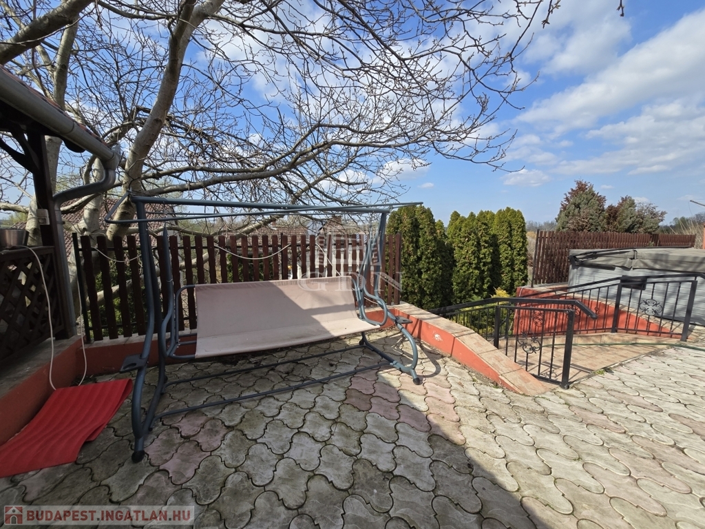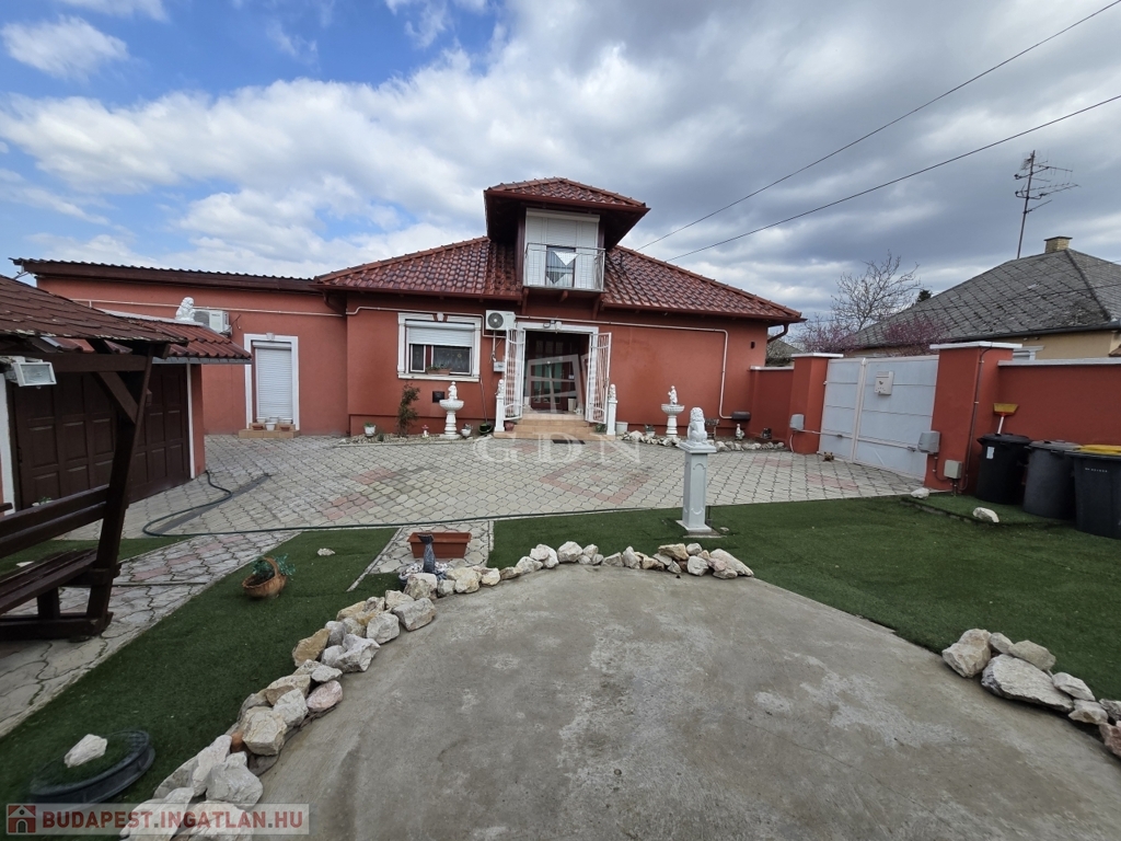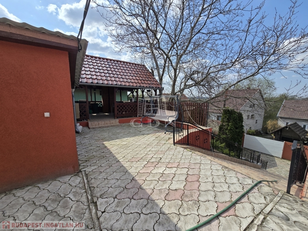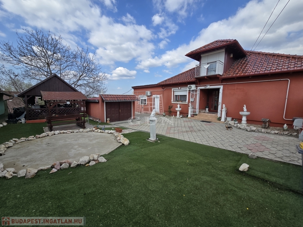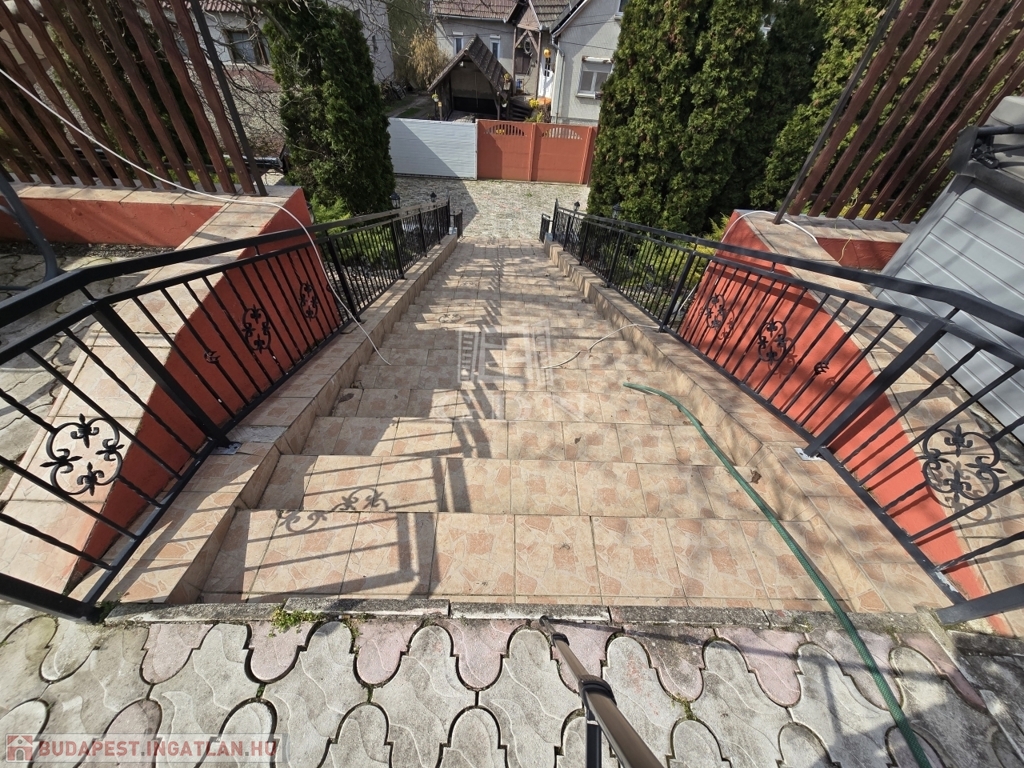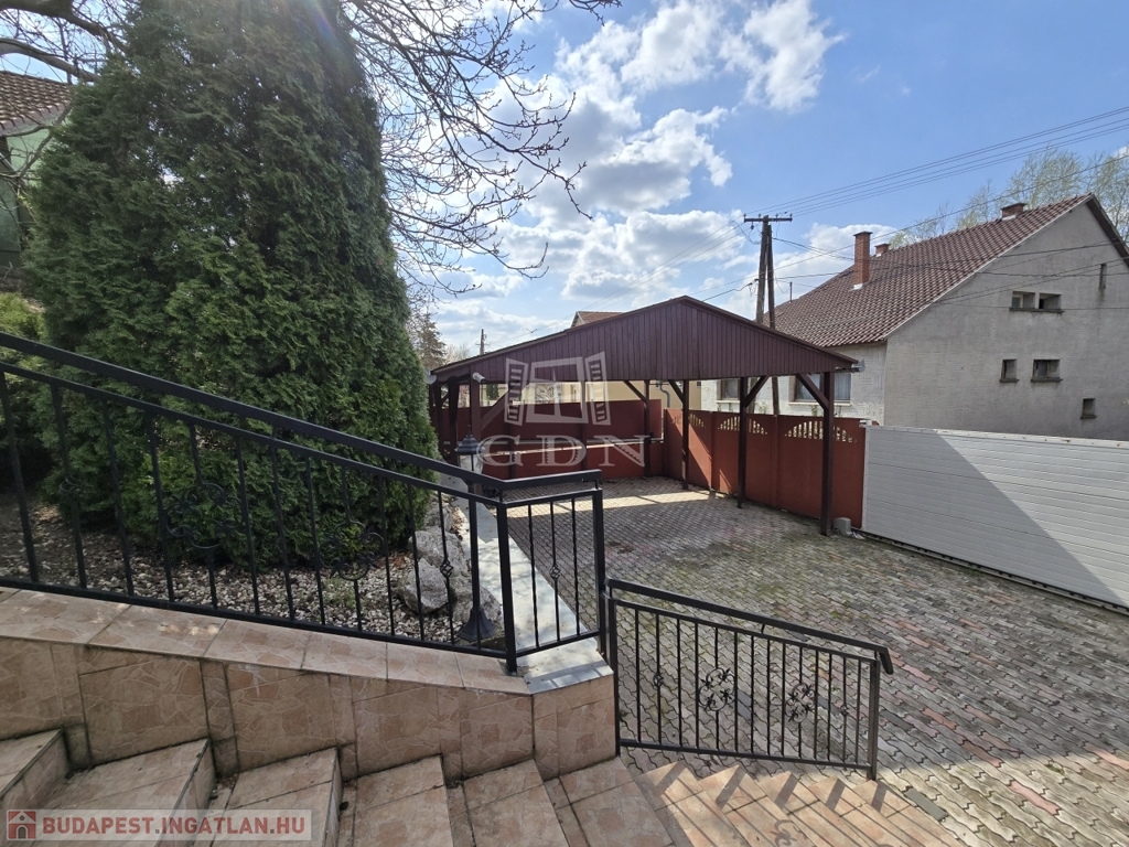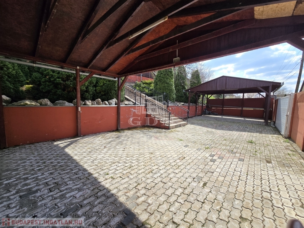 Az alsó udvar szintén részben térkövezett, és külön utcáról is megközelíthető. Itt két fedett gépkocsibeálló került kialakításra, amelyek alatt akár több jármű parkolása is kényelmesen megoldható, így az ingatlan nemcsak nagycsaládosok számára ideális, hanem akár vállalkozási vagy befektetési célra – például szállásadásra – is kiváló lehetőséget kínál.