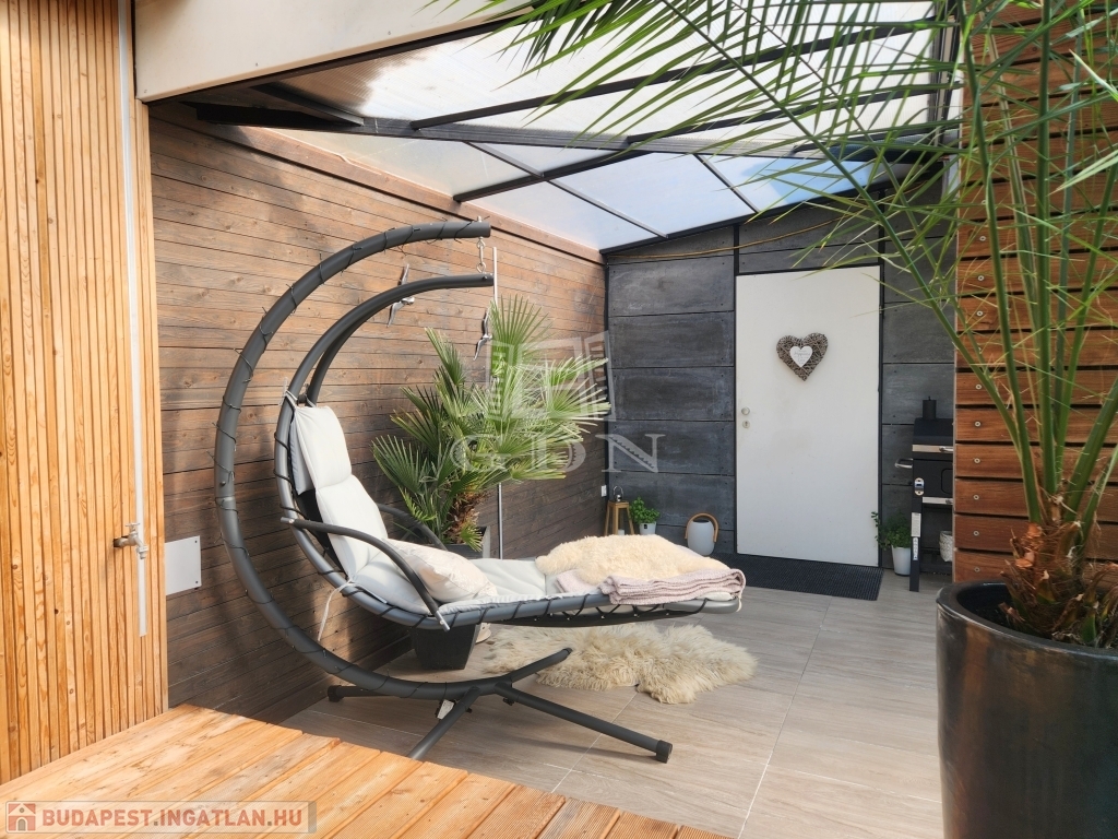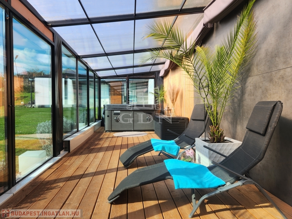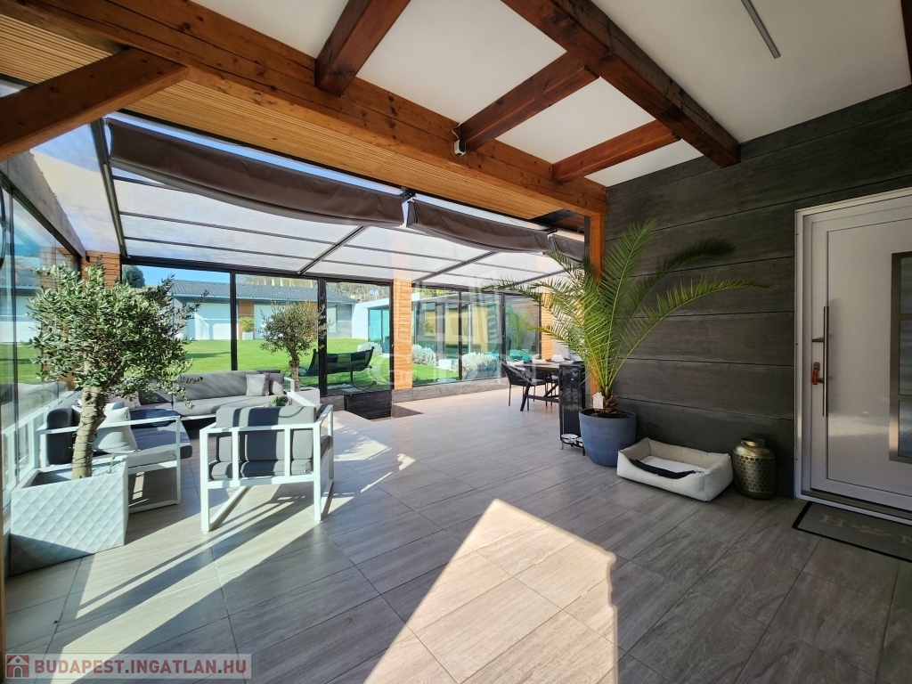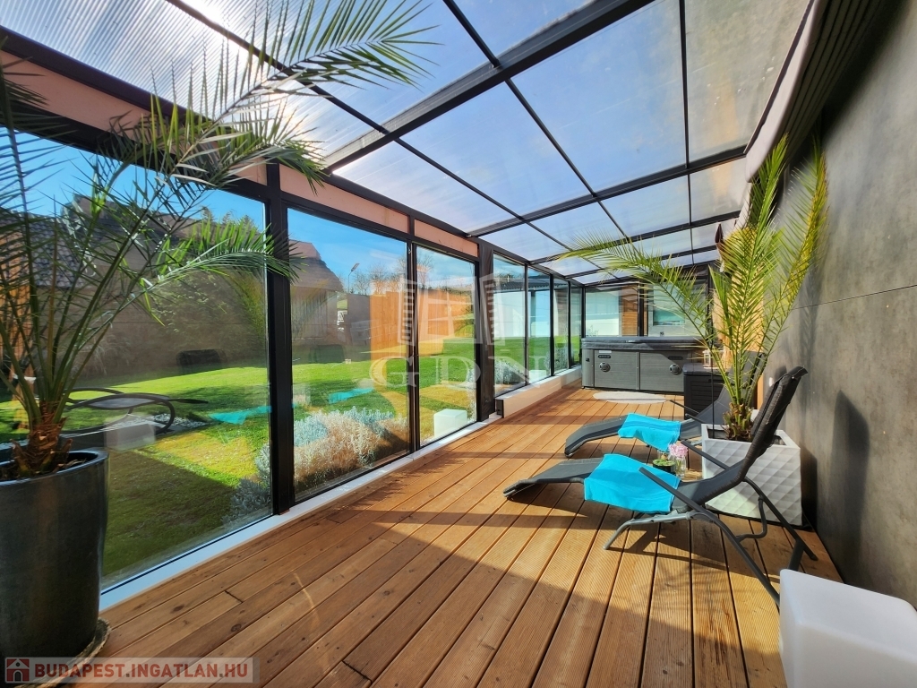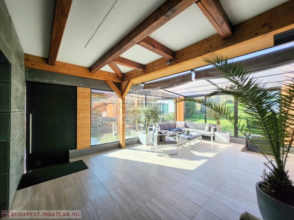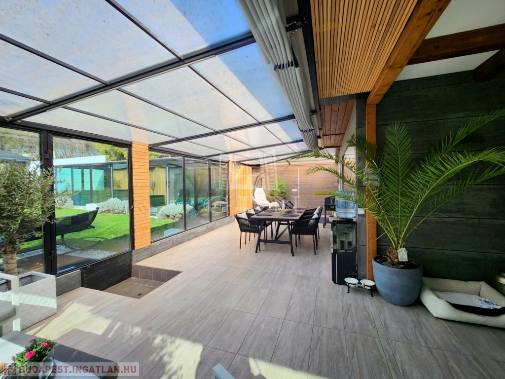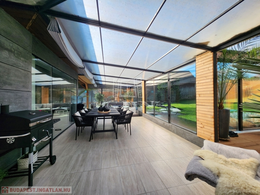 Csendes, árnyékolókkal ellátott 80 m2-es terasza pihenésre, családi összejövetelekre, kikapcsolódásra " született". Óriás üvegfelületei, kertre néző kilátása és a nyugalom, amely árad belőle, páratlan érzést képes nyújtani!