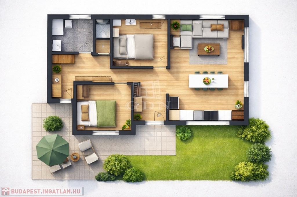 A nagyméretű telek további lehetőségeket kínál: kert, pihenőtér, bővítés vagy akár egy komplexebb fejlesztés is megvalósítható rajta.