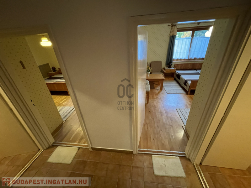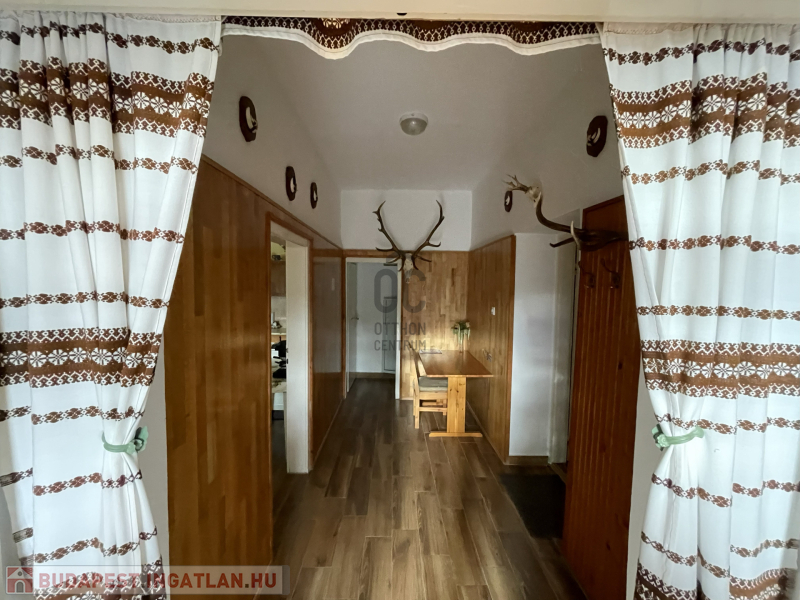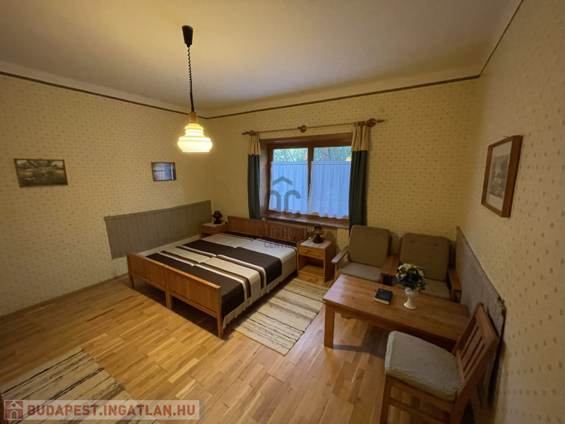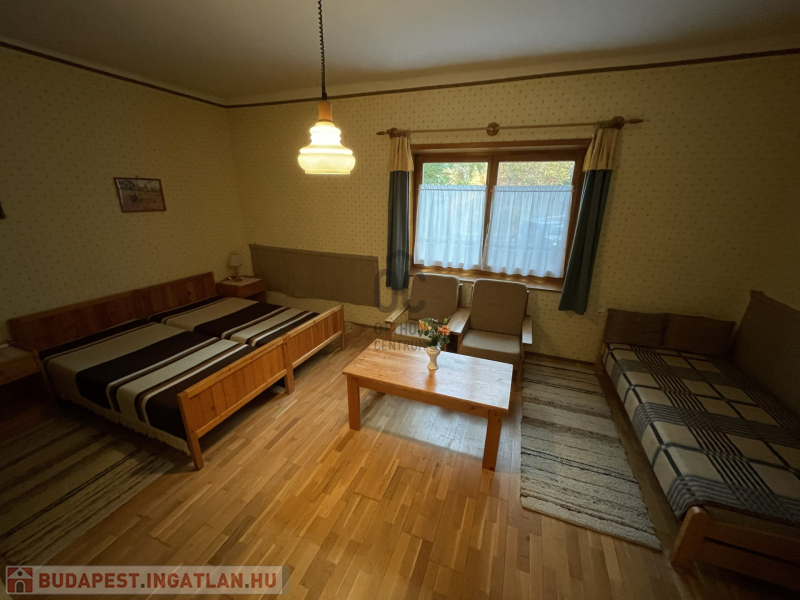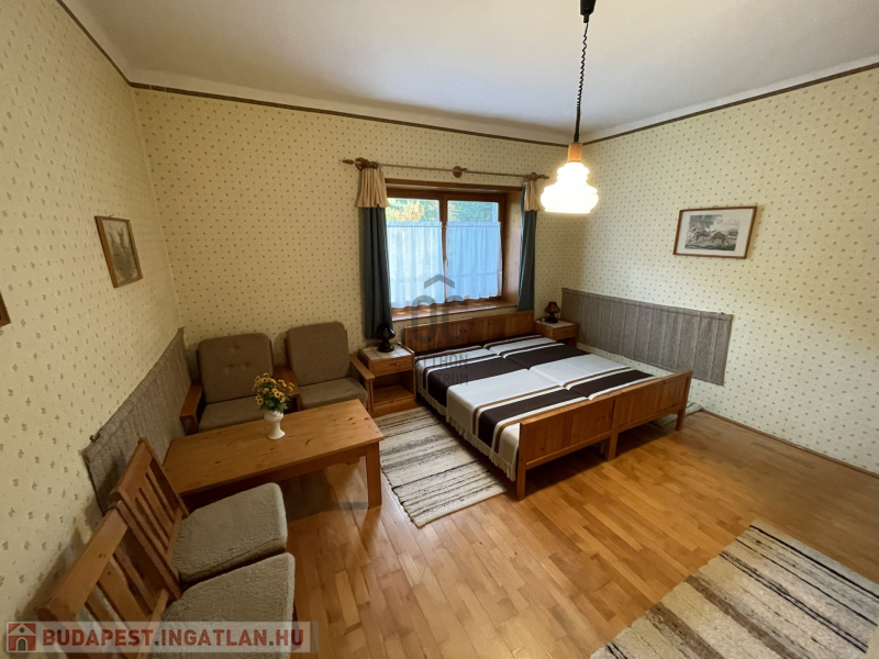 Ebben a környezetben vált eladóvá ez az apartmanház, mely kisebb átalakítása, modernizálása után kiválóan hasznosítható, kiadható. A terület hatalmas és gyönyörű környezetben van, távol a város zajától. Három szoba, mindhárom szobához külön fürdőszoba,egy nagy közösségi tér, előtér, konyha alkotja. Fűtése cserépkályhával megoldott. Nyílászárói jó állapotú fa szerkezetűek. A szobák, közösségi terek burkolata, külső fal, tető, megkímélt állapotúak.