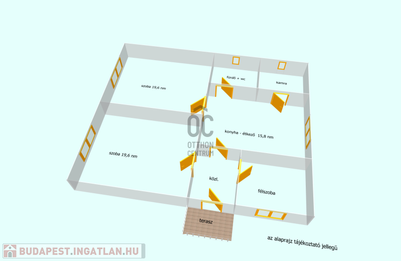 Az épületbe egy kicsi teraszon át léphetünk be, amire pár lépcső vezet. Az előszobából nyílik balra az egyik szoba, jobbra a félszoba és szemben pedig a konyha-étkező helyiség. Innen tudjuk megközelíteni a másik nagy, világos szobát, a kádas fürdőszobát, valamint a kamrát, ami egyben a padlásfeljáró is. Ezek a helyiségek akár összenyithatóak is, így kialakítva egy tágas fürdőt, vagy külön megoldható a toalett-kézmosó, de ne rám hallgasson, hanem engedje szabadon a fantáziáját úgy, hogy élőben látja!
