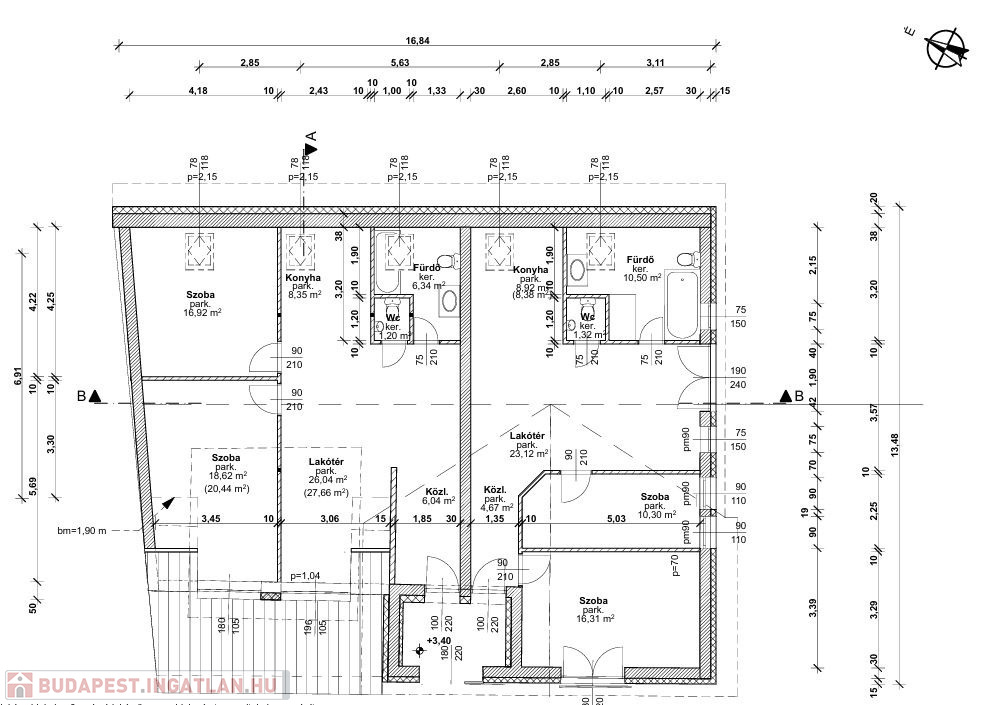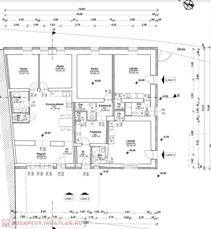 Az alsó szinten a tervek szerint 4 lakás lett kialakítva, ahol a belső falak már állnak, így a vásárló könnyen befejezheti az építkezést.