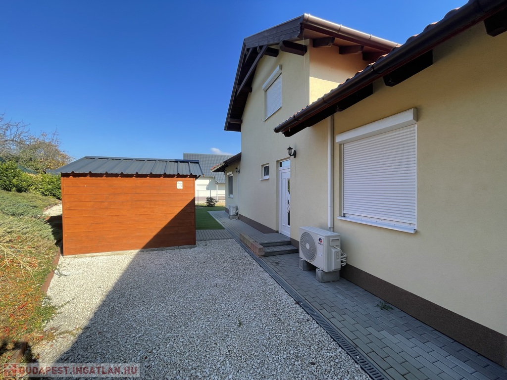 A gondozott kertben 9 m²-es faház szolgál tárolóként. 4 autó számára kialakított parkoló kényelmes megoldás a család minden tagjának. Közművek: víz, villany (földkábeles), csatorna – a gáz a telekhatáron belül elérhető.
