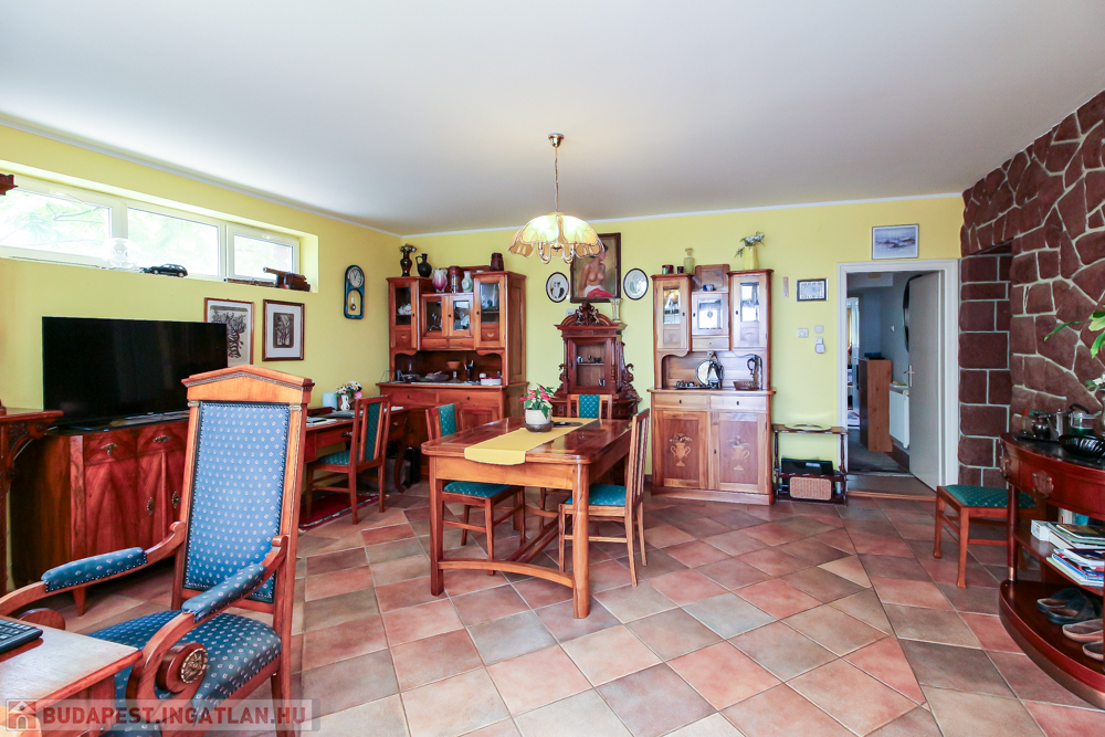 Az épület a 90-es évek derekán a térségre jellemzően vöröskőből és téglából épült. Ez a remek állapotú ház mérete nettó 140 négyzetméter és egy hamisítatlan balatoni borospincét is magában rejt . Ősfás kertje kiváló helyet biztosít a kültéri kikapcsolódásra, legyen szó sütögetésről, családi összejövetelekről, napozásról, a lényeg, hogy itt kipihenheted magad. Megközelítése aszfaltozott úton lehetséges, a strandtól kb. 1.5 kilométerre helyezkedik el.