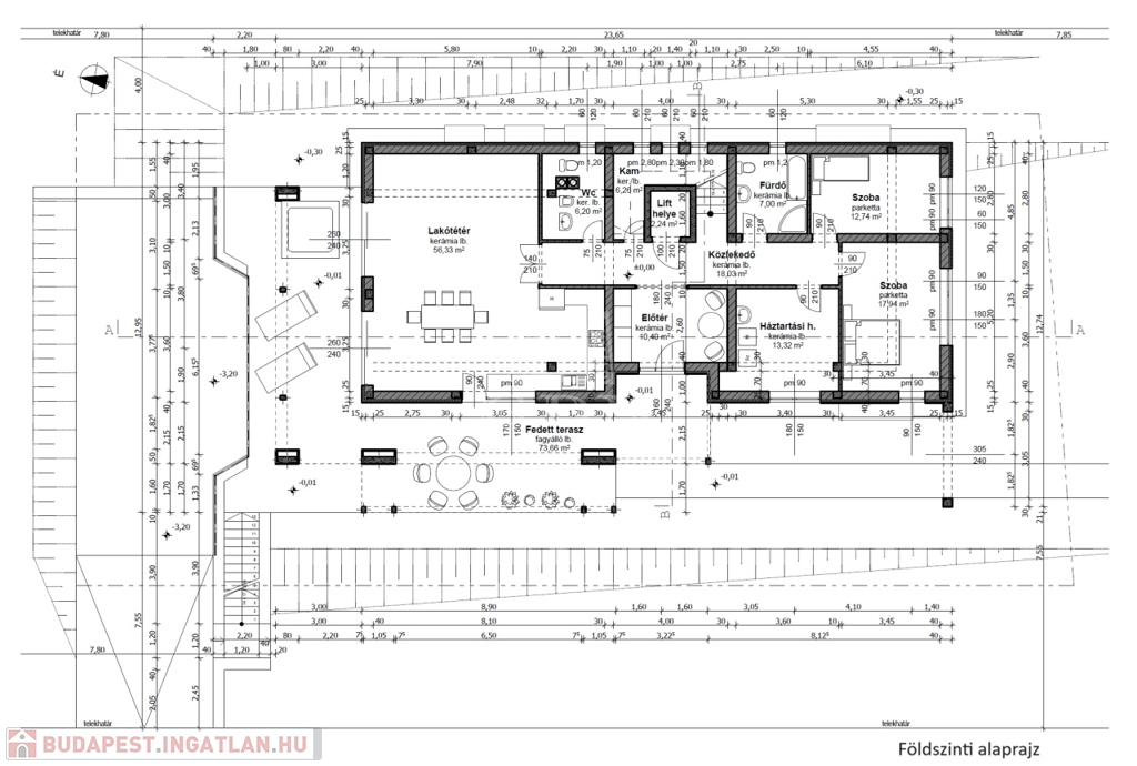 A 150 nm-es nettó alapterületű földszinten nagyméretű előszoba, 1 amerikai konyhás nappali, 2 hálószoba, 2 fürdőszoba, háztartási helység, kamra található. Körbe fedett 73 nm-es terasszal rendelkezik.