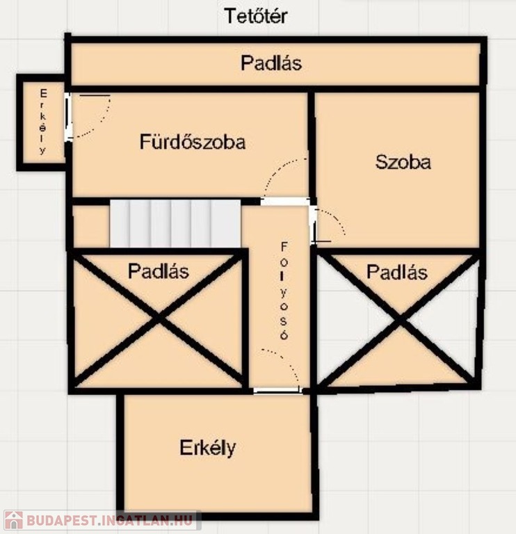 A tetőtérbe az előszobából egy felújított mahagóni falépcsőn jutunk fel. Itt kapott helyet egy fürdőszoba, melynek erkélyéről gyönyörű kilátás nyílik a Tamás-hegyre. A fürdő padlózata programozható elektromos fűtéssel van ellátva, és a meleg vizet egy külön 80 literes villanybojler biztosítja.