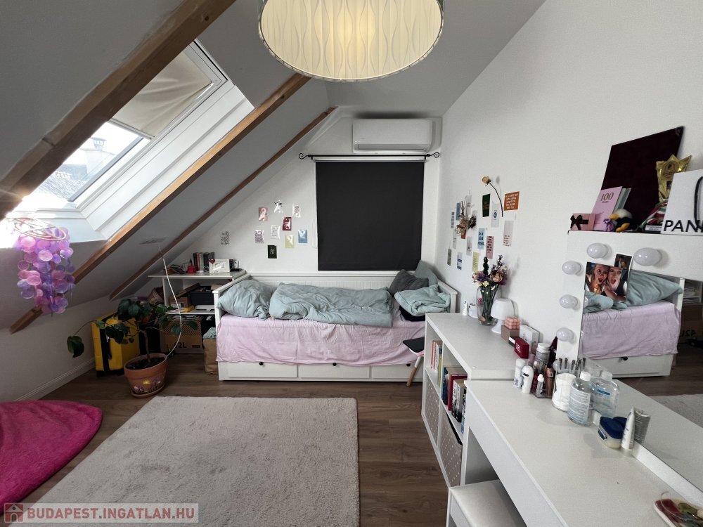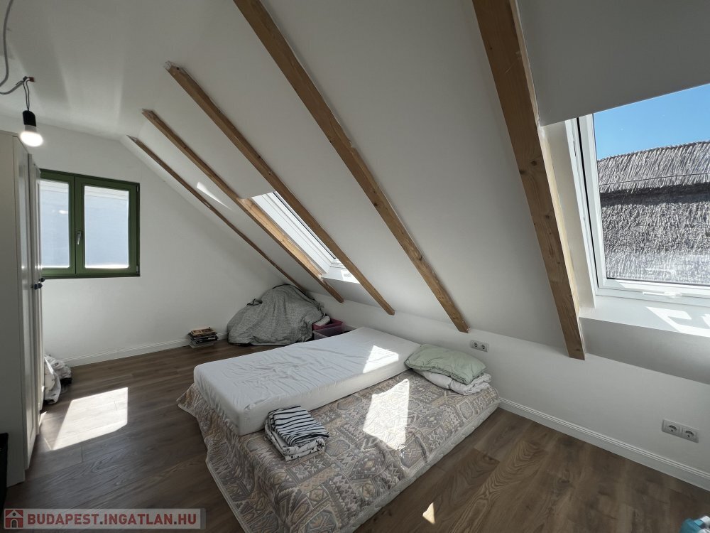 A tetőtér Roto fa nyílászárókkal, külső és belső árnyékolókkal felszerelt, a gyermekszobában klíma működik, a további egységek előkészítve.