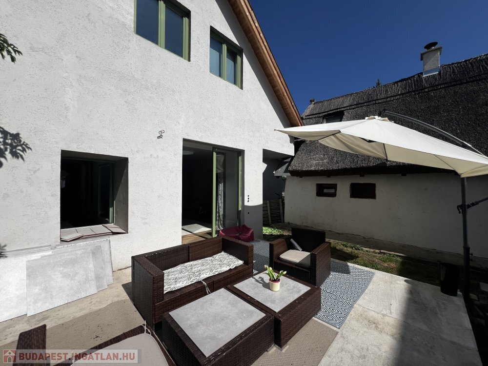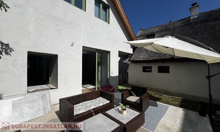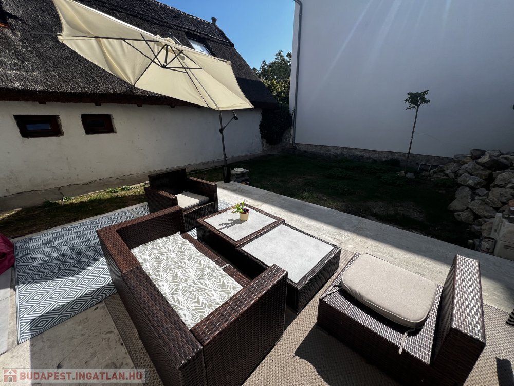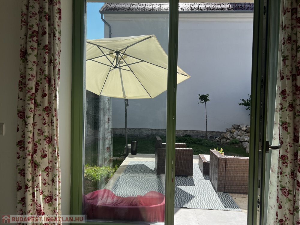 Innen tágas, világos étkező-nappali nyílik, közvetlen kijárattal a részben térkövezett, hangulatos udvarra.