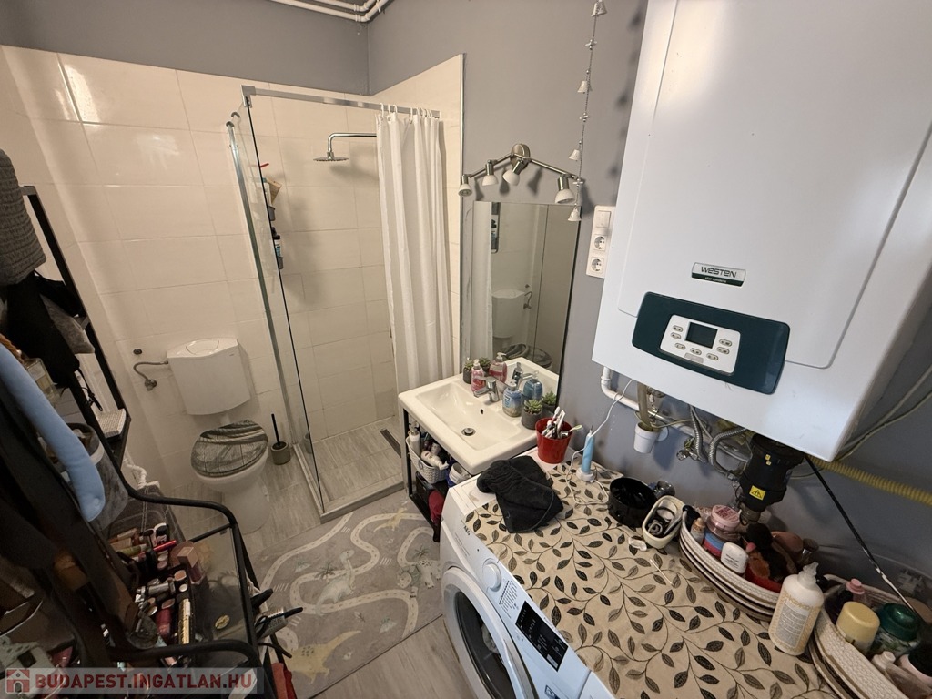 A kisebb, 40 m²-es ház külön bejárattal rendelkezik, saját fürdőszobával, konyhával és egy szobával. Fűtése parapetes gázkazánról történik, klíma és villanybojler szintén rendelkezésre áll.