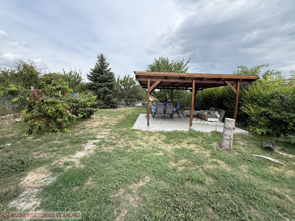 Az udvar minden szempontból jól átgondolt: térkövezett, rendezett, akár autó számára is biztosít parkolást. Egy 25 m²-es, fedett kiülő teremt kellemes, árnyékos pihenőhelyet, emellett fa tároló gondoskodik a kerti szerszámok és kerékpárok elhelyezéséről, valamint a ház alatt egy 12 m2-es pince is megtalálható.