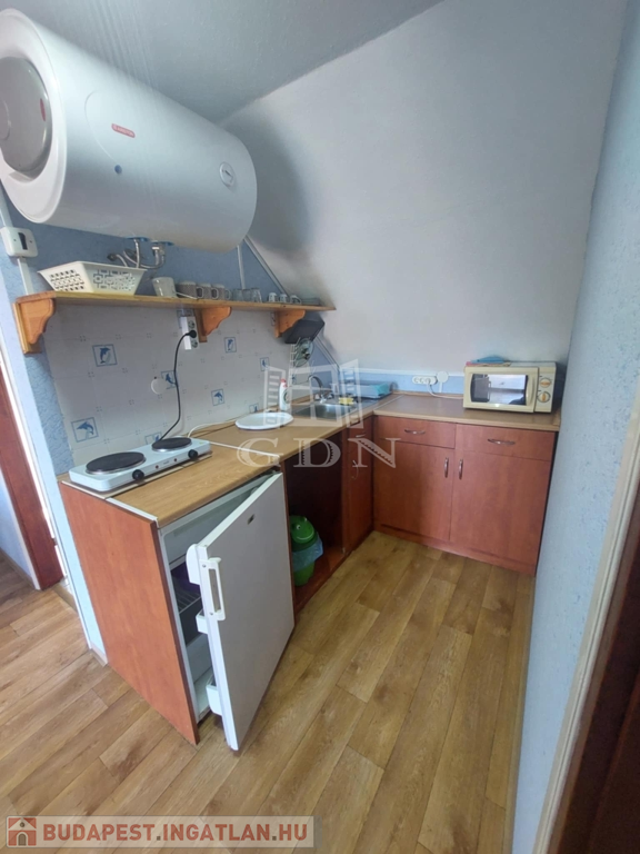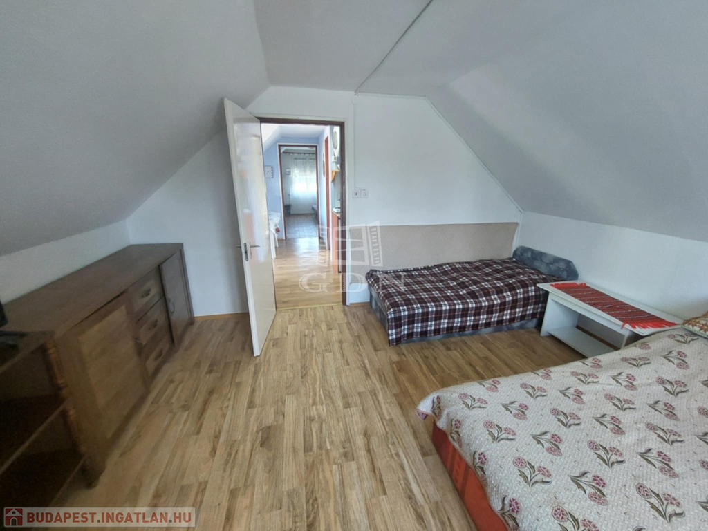 A beépített tetőteret külső lépcsőről érjük el, ahol egy konyha-társalgóból nyílik két hálószoba, valamint a fürdő.