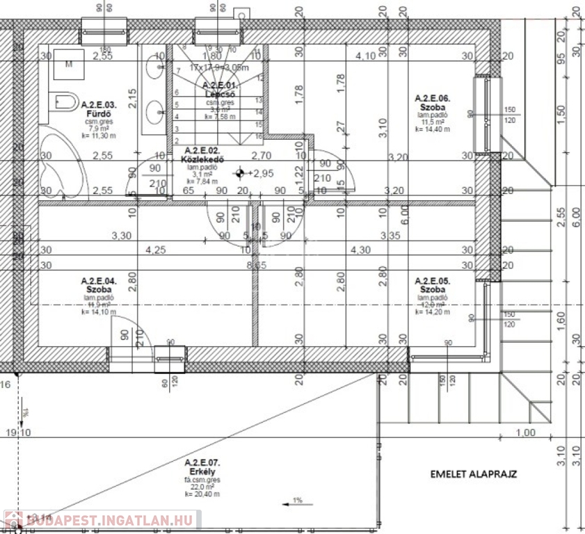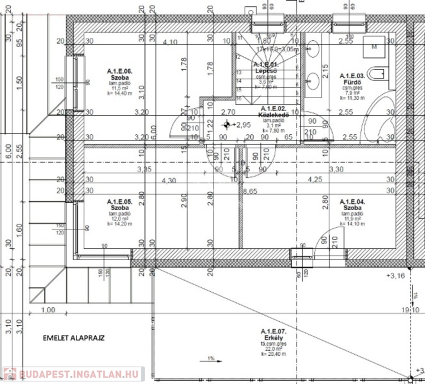 Emelet (50m2): 3 szoba, fürdő+wc, erkély (22m2)