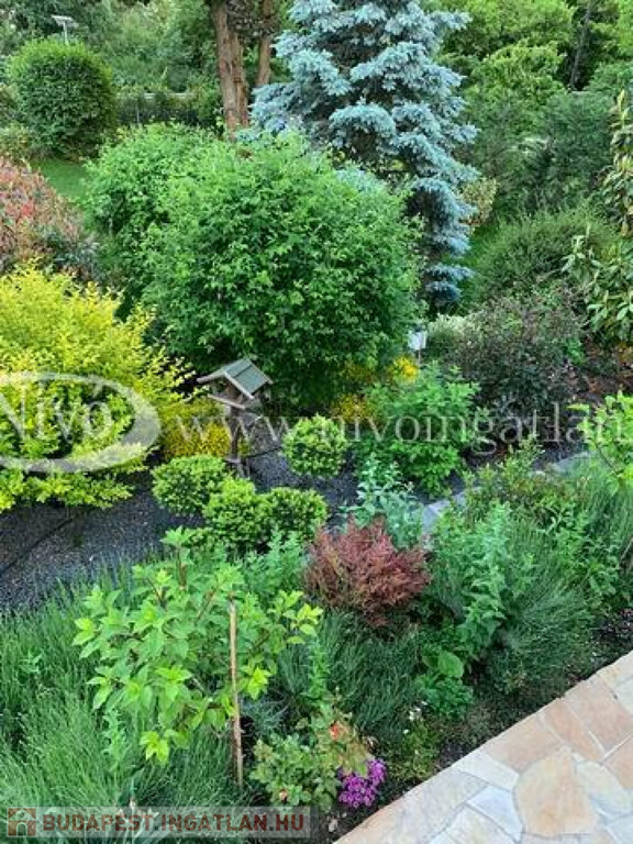 Az ingatlan 949 m2-es elektromos kapuval ellátott, körbekerített, parkosított, több mint 100 féle növénnyel beültetett (mediterrán növények, ritka fák, veteményes-és fűszerkert) gondosan karbantartott telken helyezkedik el, ahol kialakításra került egy hangulatos, teljesen felszerelt, gépesített, 21 m2-es nyári konyha, egy 24 m2-es kocsibeálló illetve több autó számára viacolor térkővel burkolt kocsibeálló is illetve még kerti zuhanyzó, bográcsozó-grillező és egy tároló kamra is megtalálható. A kertben van még fúrt kút és a locsolórendszer is ki van építve.