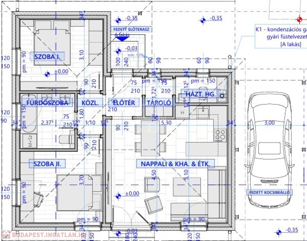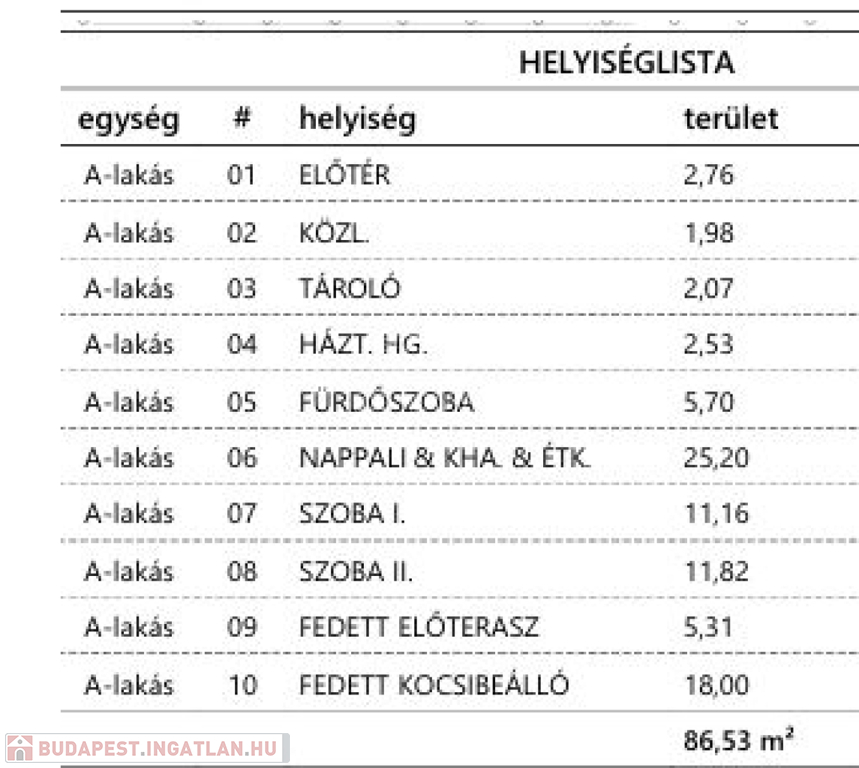 A házhoz tartozik még 5 nm terasz és 18 nm fedett gépkocsibeálló is.