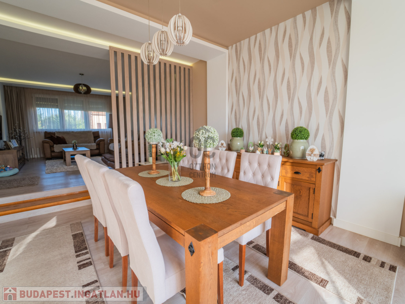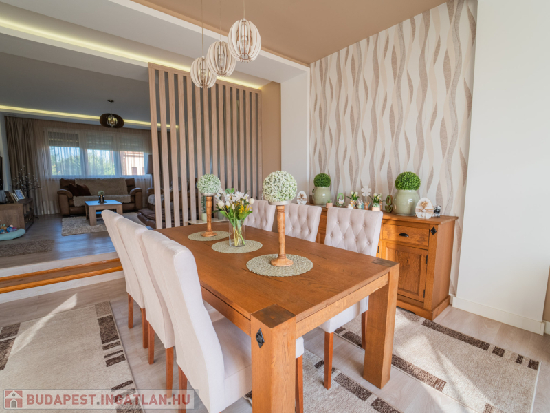- konyha- étkező ( közvetlen terasz kapcsolattal) és nappali egy légtérben került kialakításra a földszinten, ahol még fürdőszoba, kölön WC, kamra és előszoba található