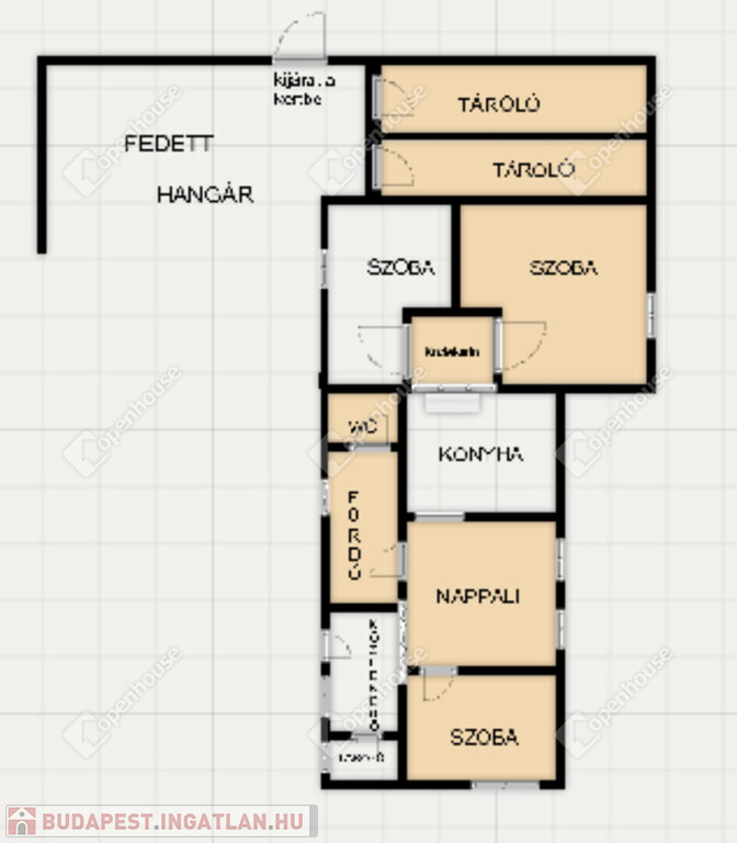 Az épület folytatásában, az udvarról megközelíthetően található két további tároló, valamint egy nyitott hangár, amely sokféle célra alkalmas lehet (parkolás, fedett tárolás, hobbihelyiség).